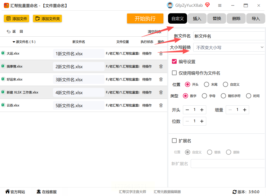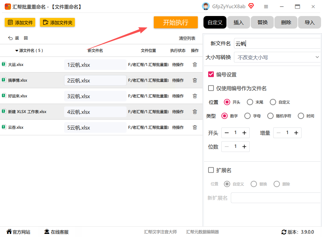 4. 预览窗口会实时显示修改后的文件名,确认没问题后点「执行」。