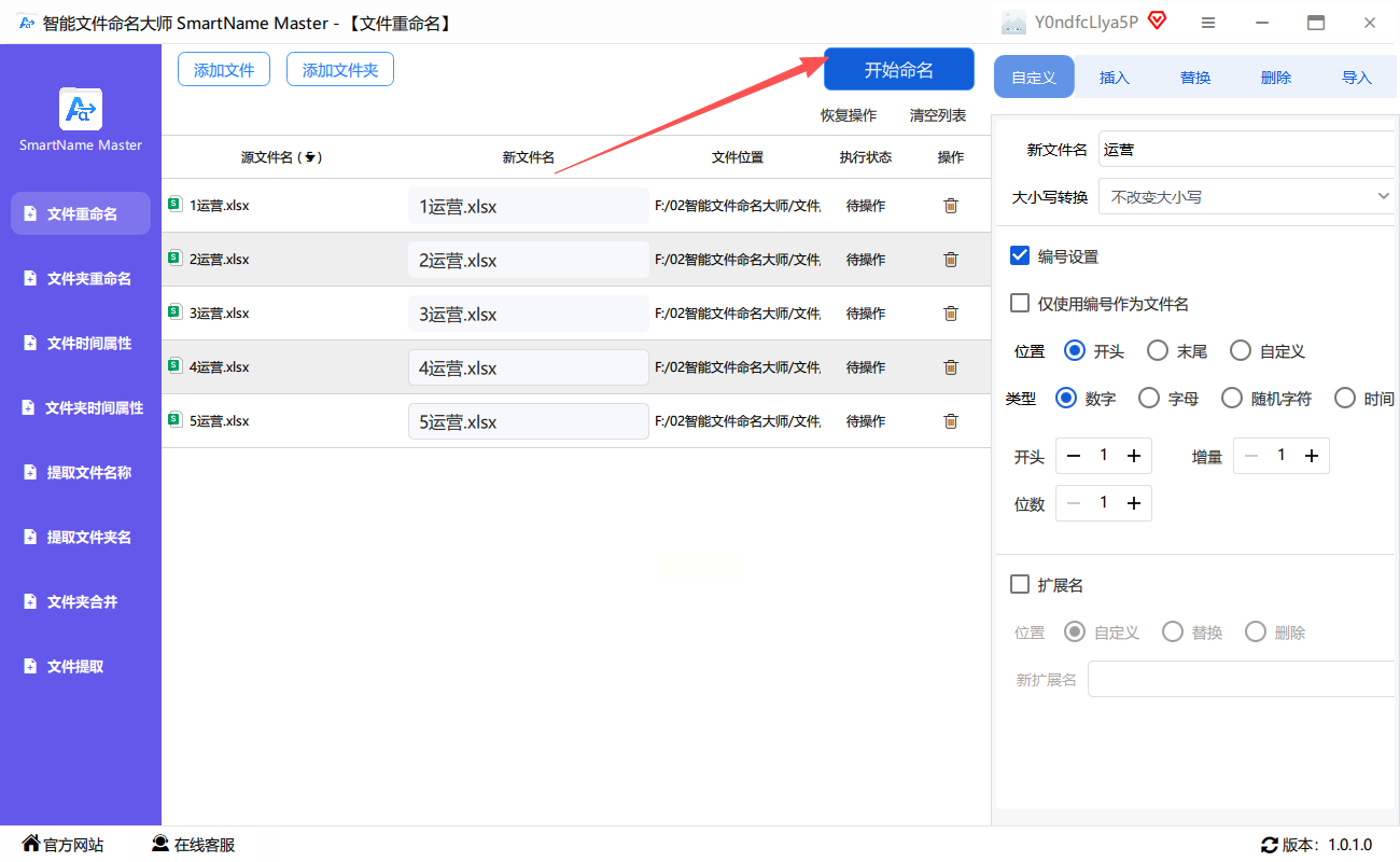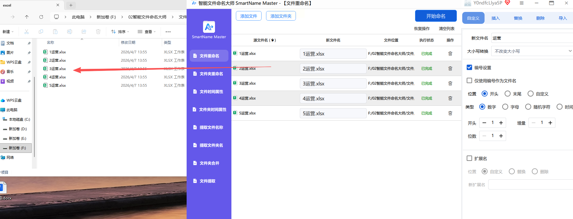 3. 在右侧「命名规则」里填写新名称,比如想按日期+序号命名,格式可以设为"Report_20231025_{N}"({N}代表序号),轻松实现excel文档批量重命名。