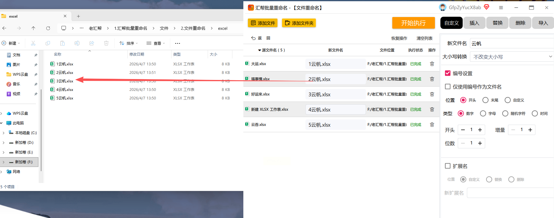 5. 点击「开始执行」,稍等几秒(文件数量多时会多等一会儿),左侧预览区域会显示重命名效果,确认无误后工具会自动完成修改。
