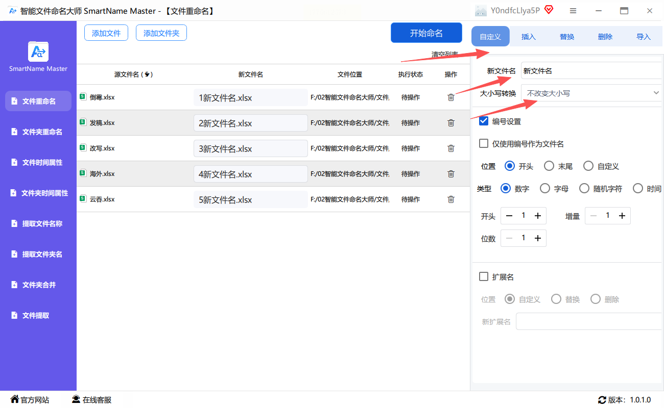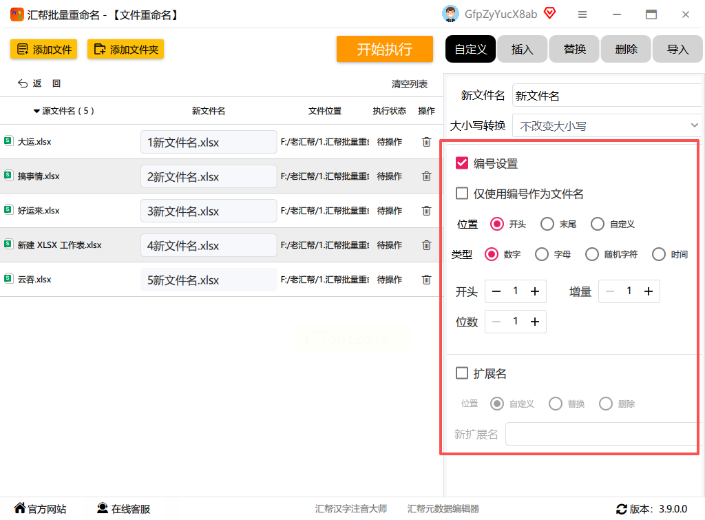 3. 右侧设置新文件名规则:比如想加前缀"2023Q3_",就在「前缀」框填"2023Q3_";如果需要序号,勾选「编号」并设置起始数字(如从1开始)。
