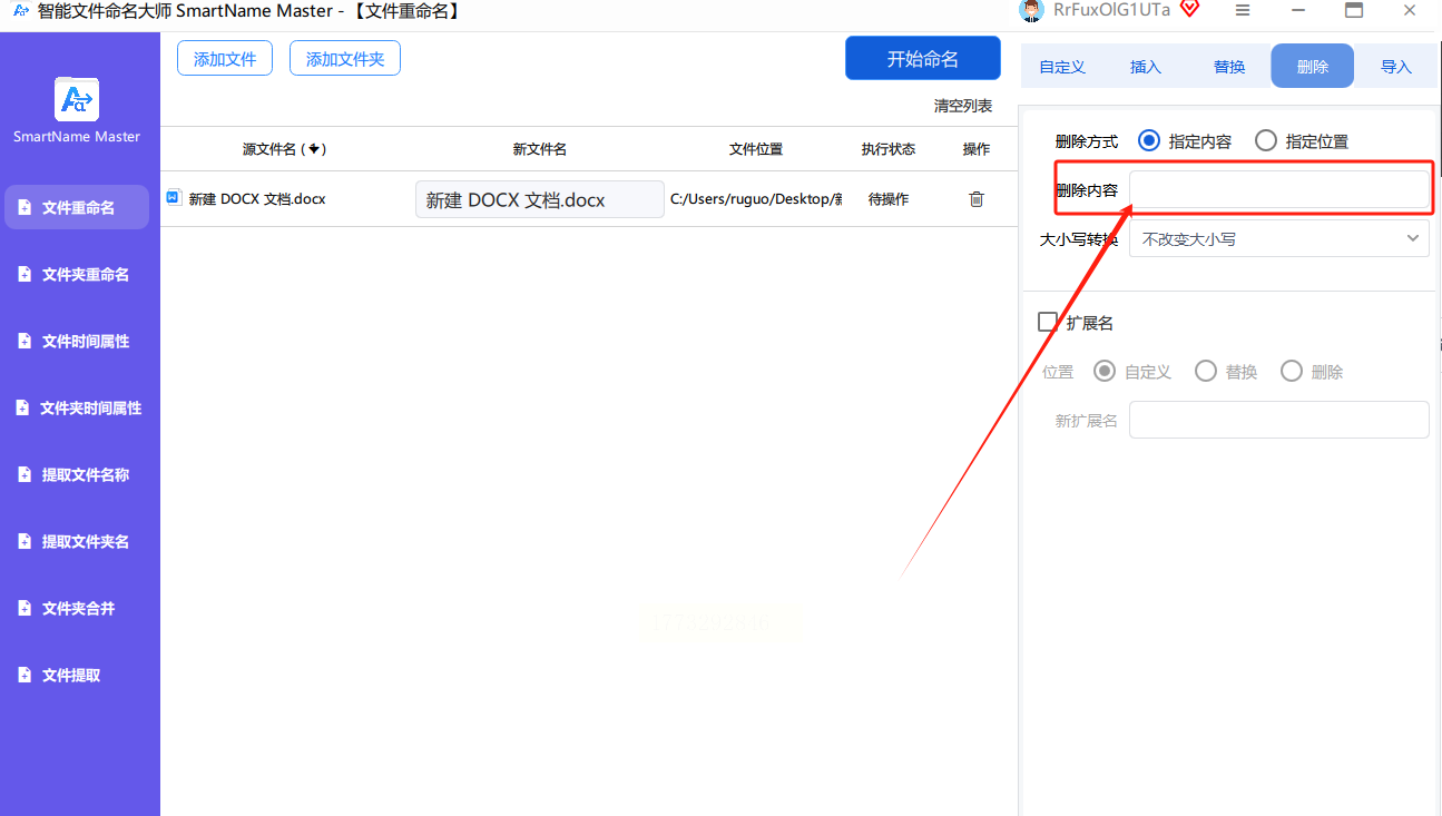 在右侧设置面板中找到「替换/删除」选项,选择「删除指定内容」。在输入框中按一下键盘上的空格键(注意区分全角/半角,一般选半角空格),软件会自动识别所有含空格的文件名。