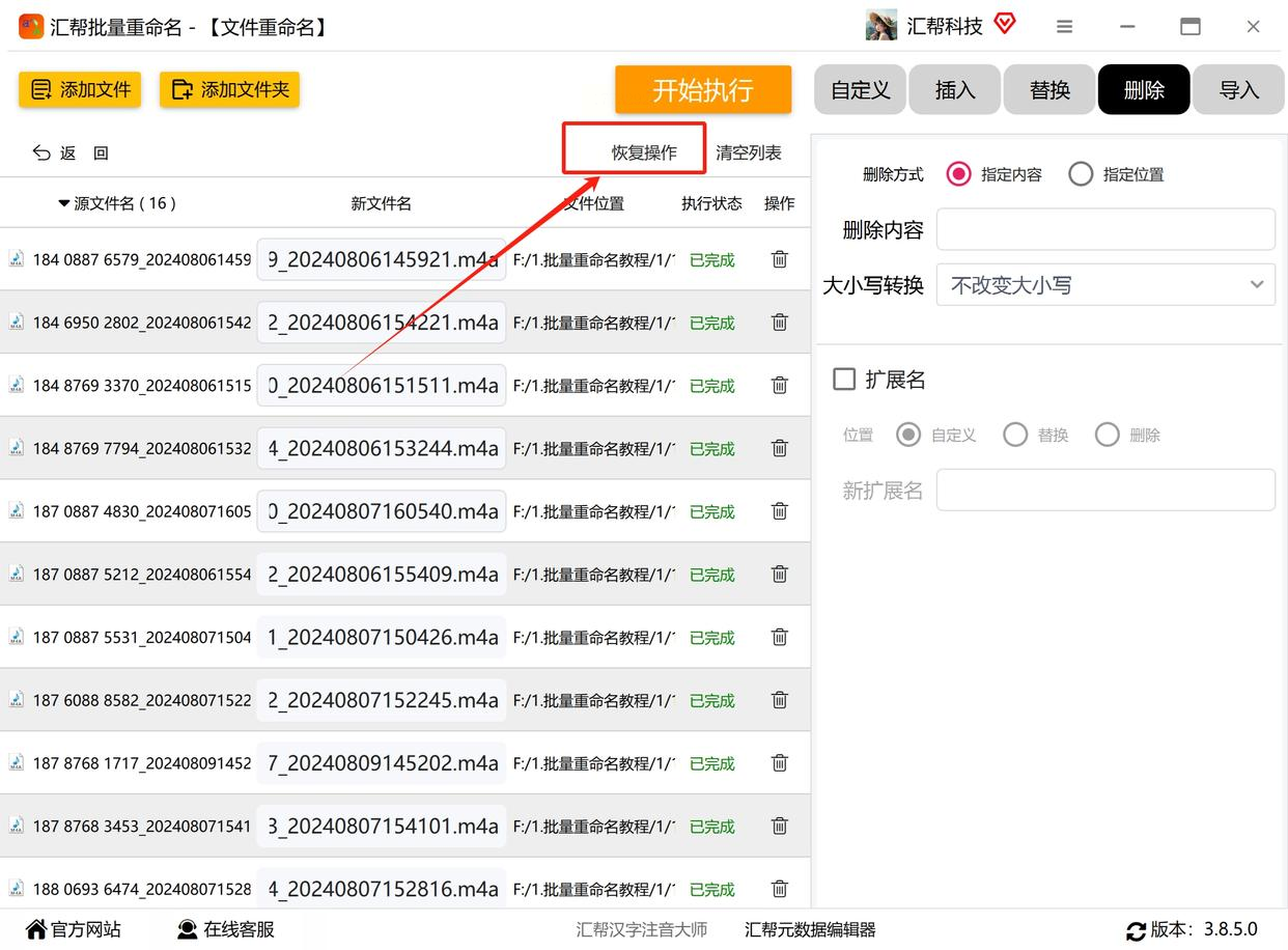 点击「开始执行」,软件会按规则重命名所有文件。完成后打开原文件夹,对比修改前后的文件名,确认空格已全部删除。若需撤销操作,点击「恢复操作」即可(仅保留最近一次操作记录)。