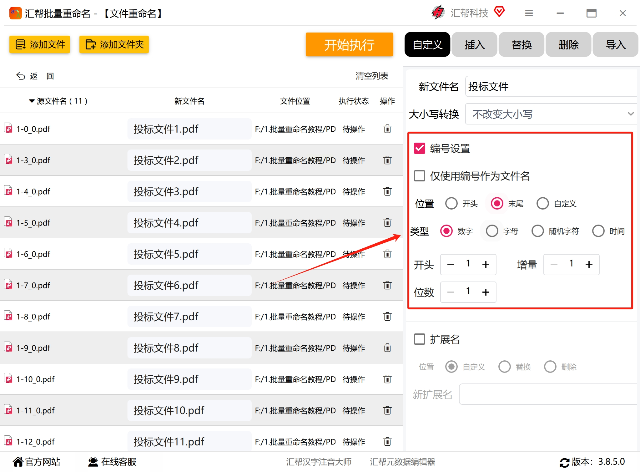 - 如果需要给文件编号(比如"报告1_第1行内容.pdf"),点击"编号设置",选择"末尾添加编号",起始数字设为1,步长为1。