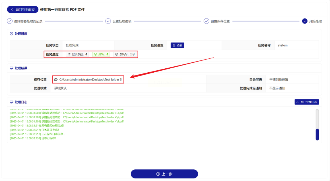 4. 执行重命名:点击"开始处理"按钮,工具会自动读取每个PDF的第一行文本,生成新文件名并保存到指定位置。处理完成后,在"保存位置"文件夹中就能看到重命名后的文件。
