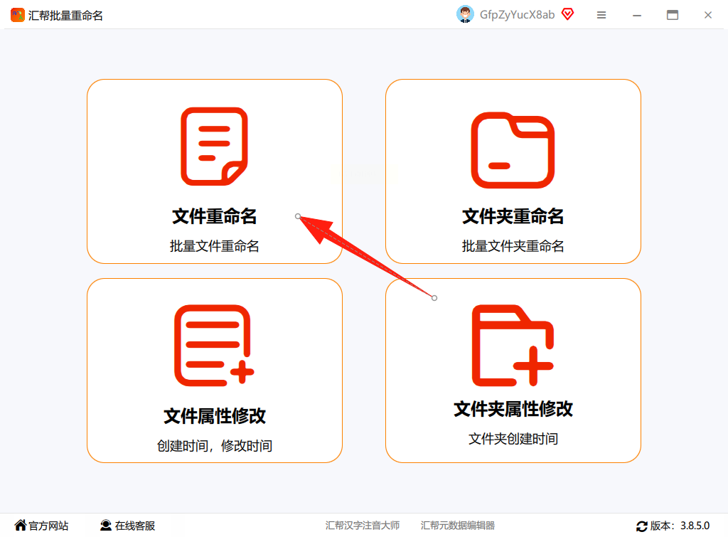 打开汇帮批量重命名软件,在主界面中找到并点击“文件重命名”选项,进入批量处理界面。