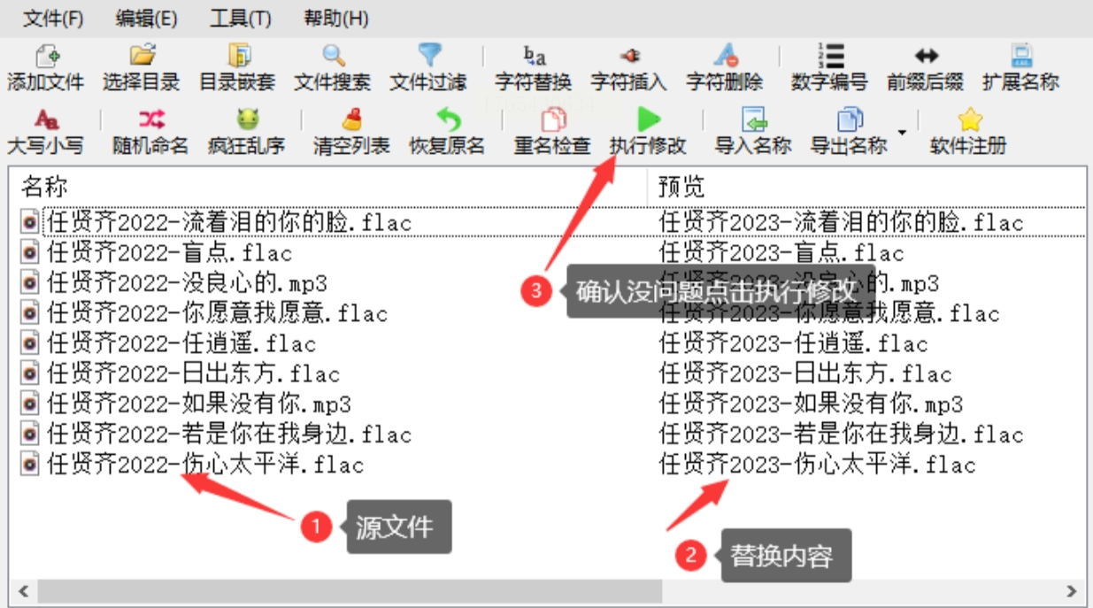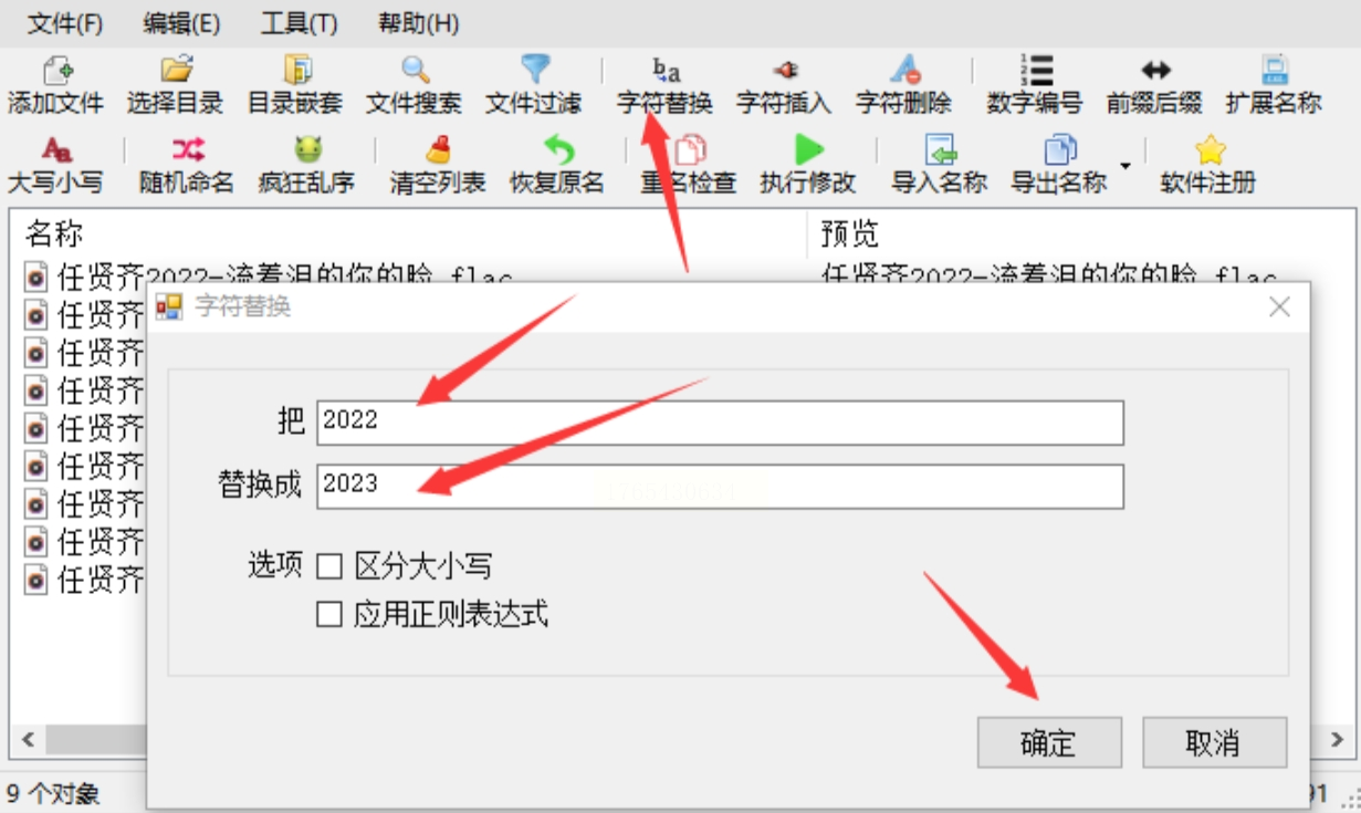 4. 预览检查:填好后点确定,软件会自动生成新的文件名预览在右边。这时候一定要仔细看!比如有些文件可能有"2022Q3"和"2022"都被替换成"2023"了,要确认没有错改漏改。