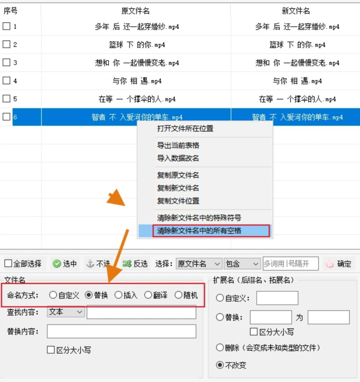 在弹出的批量重命名窗口中,选择“替换”或“删除”选项。选择“删除”中的“所有空格”选项,软件会自动处理所有文件中的空格。