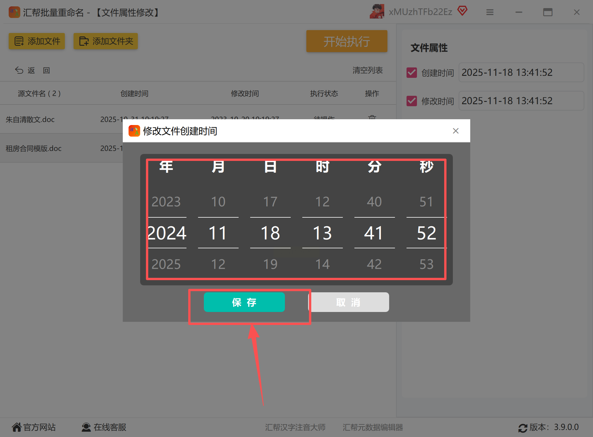 3. 时间设置界面:在右侧时间设置区,可同时调整"创建时间"和"修改时间":