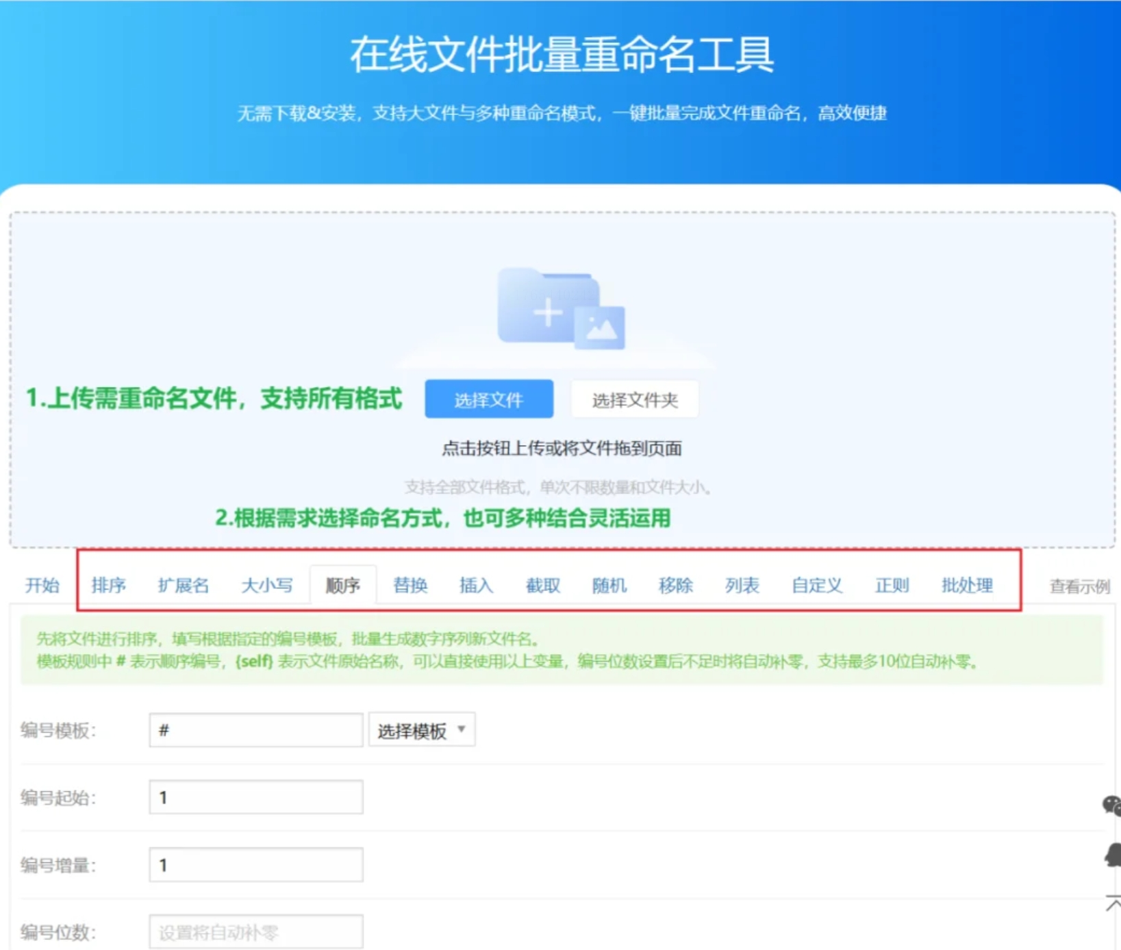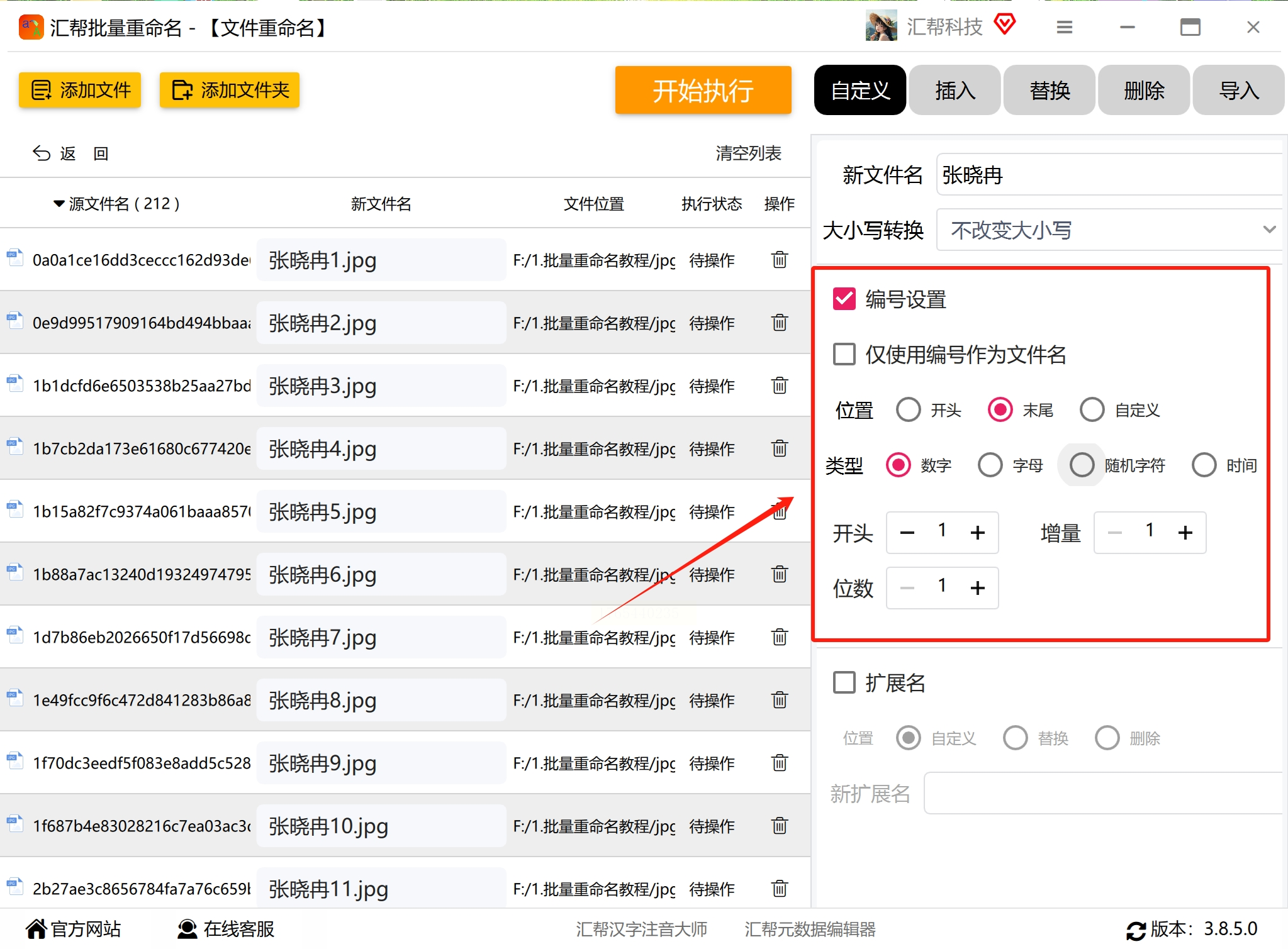 点击"添加序号"选项,设置起始编号(默认为1)、编号位数(如2位编号"01")和位置(前缀/后缀)。若需区分不同拍摄场景(如"证件照""全家福"),可在基础名称后添加场景关键词(如"张三_证件照_01")。