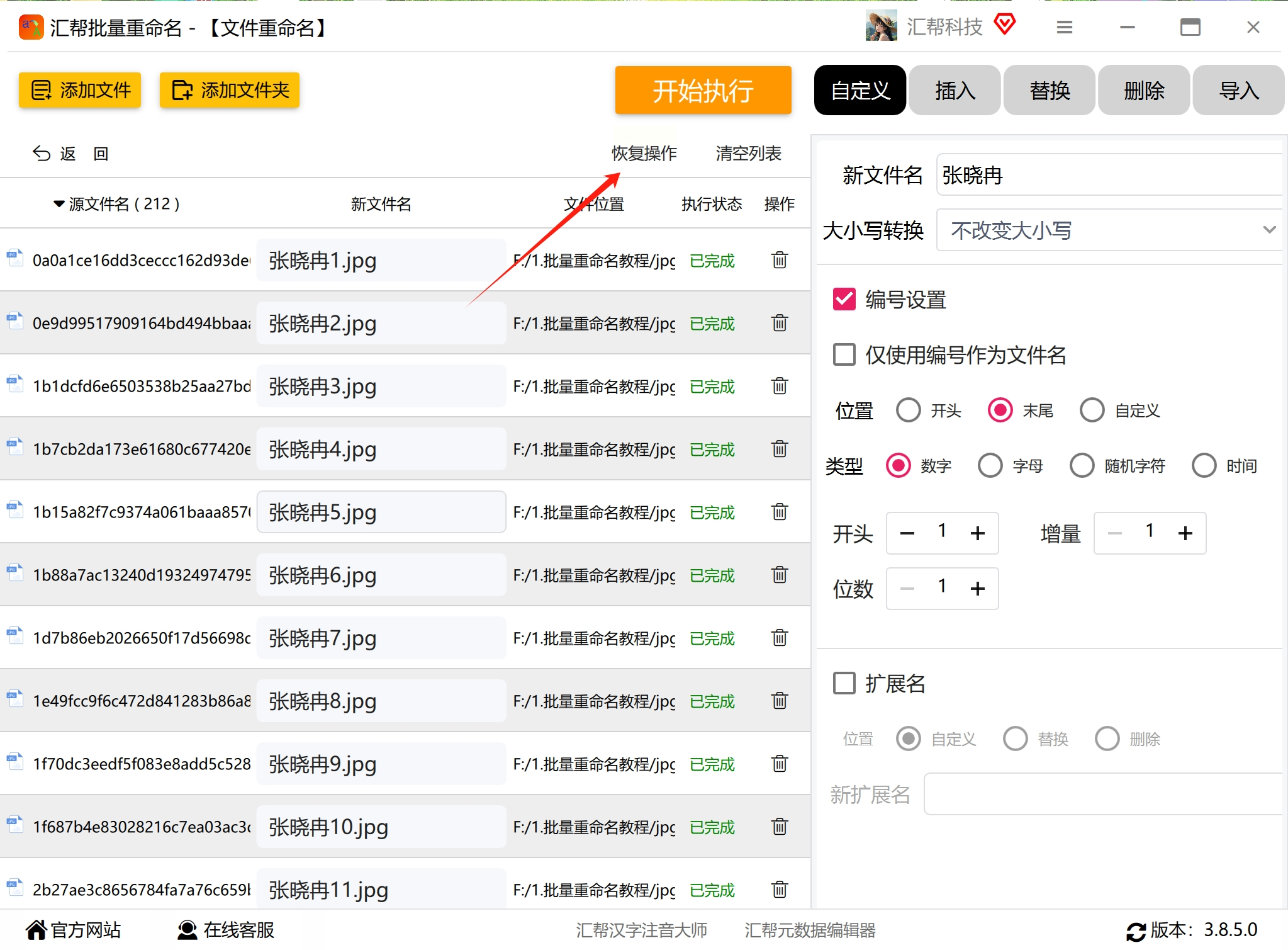 重命名前建议点击"备份文件",防止误操作。若需恢复原始命名,使用软件自带的"撤销操作"功能(注意:仅能恢复当前会话的操作记录)。