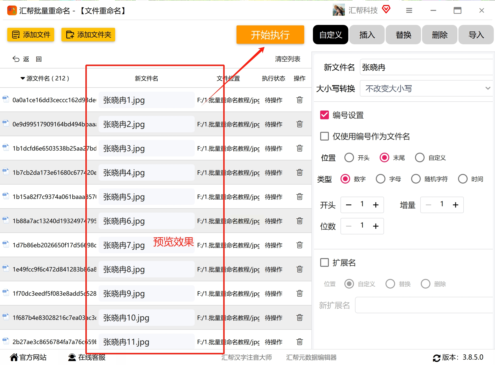 左侧实时预览命名效果,确认无误后点击"开始执行"。软件支持进度显示和错误提示。