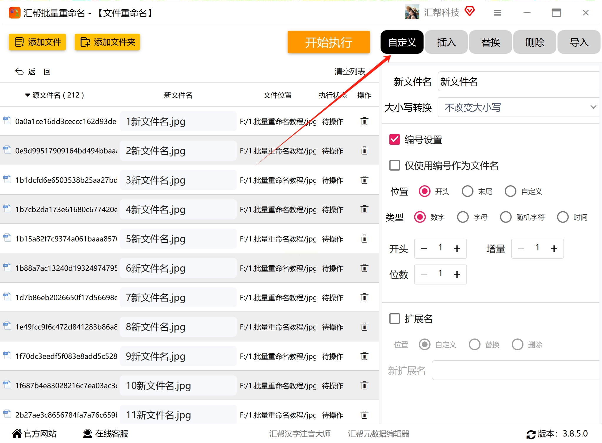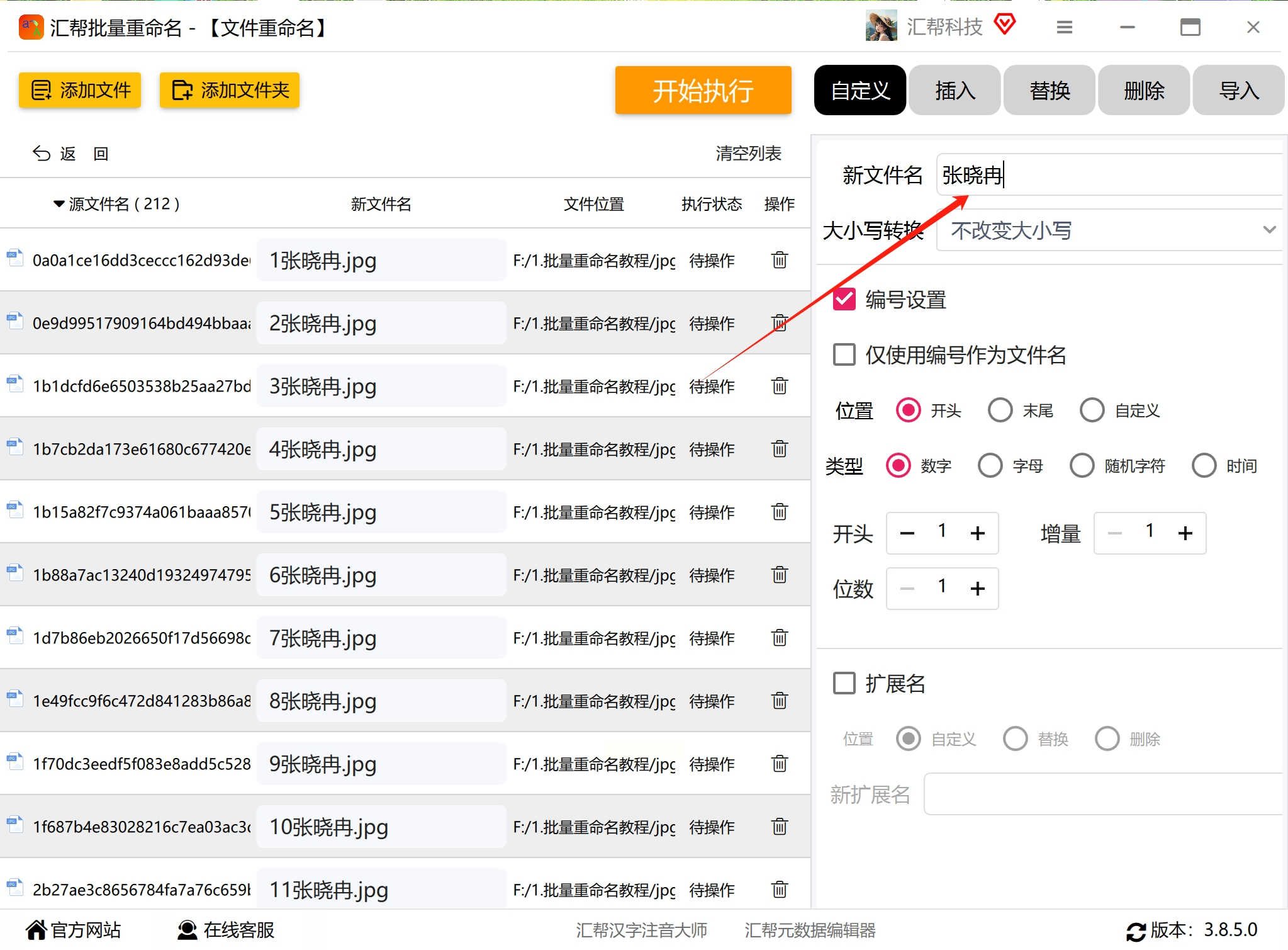 在右侧面板选择"自定义"命名模式,输入客户姓名作为基础前缀(如"张三")。建议使用分隔符(如下划线"_")或空格分隔,避免与编号混淆。