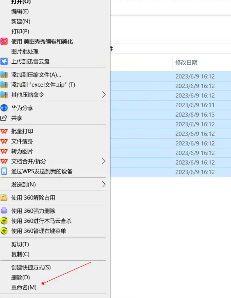在选中的任意一个文件上单击鼠标右键,从弹出的上下文菜单中选择“重命名”选项。另一种快捷方式是选中文件后直接按F2键。