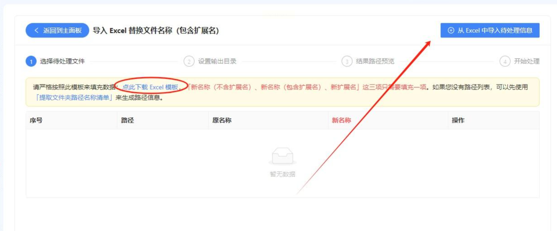 将填写好的Excel模板保存后,回到软件界面,点击“导入”或“选择文件”按钮,将刚才准备好的模板文件导入软件。导入成功后,软件界面会显示新旧文件名的对比预览,供您最终确认。