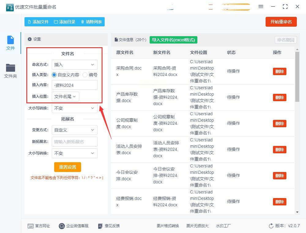 在软件设置区域,首先将命名方式选为“插入”。接着,在插入类型中选择“自定义内容”,并在相邻的文本框中输入要添加的具体字符。最后,根据需求设置插入位置,如需在文件名后添加则选择“文件名尾”选项。