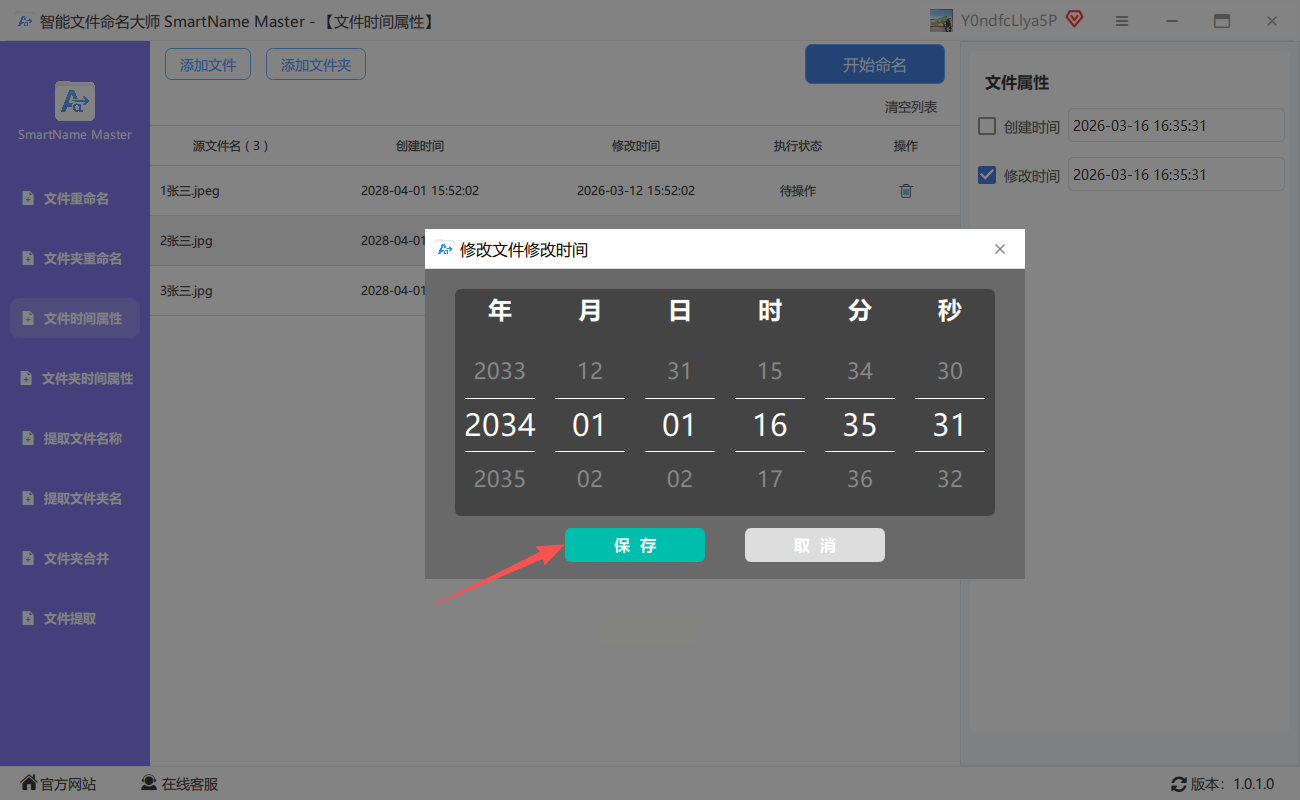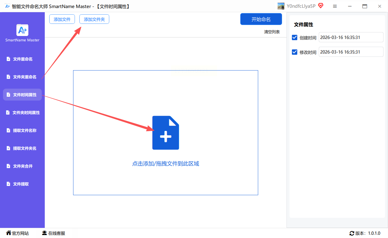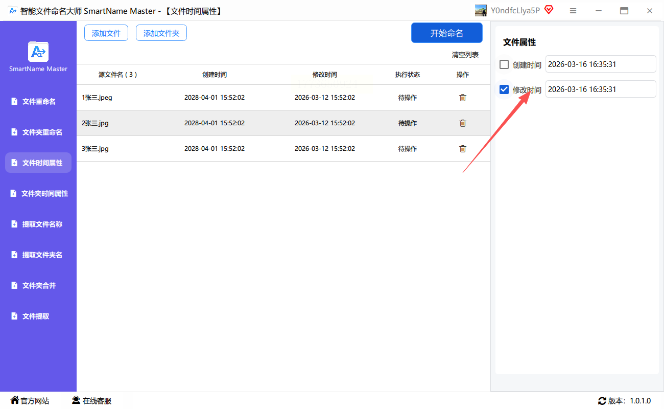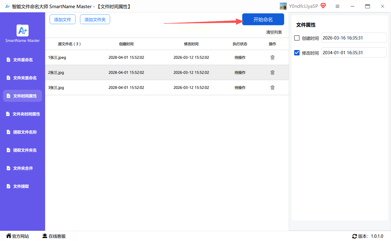 打开智能文件命名大师,在主界面选择“文件时间属性”选项。