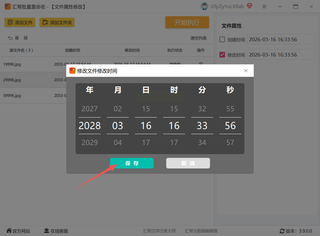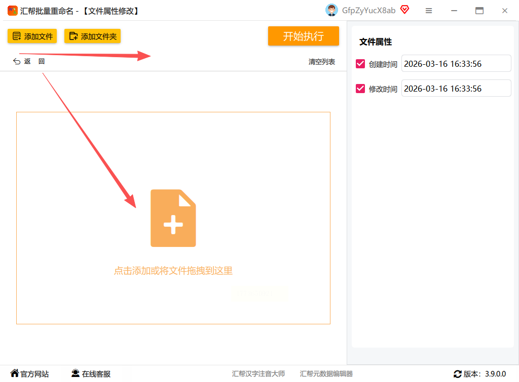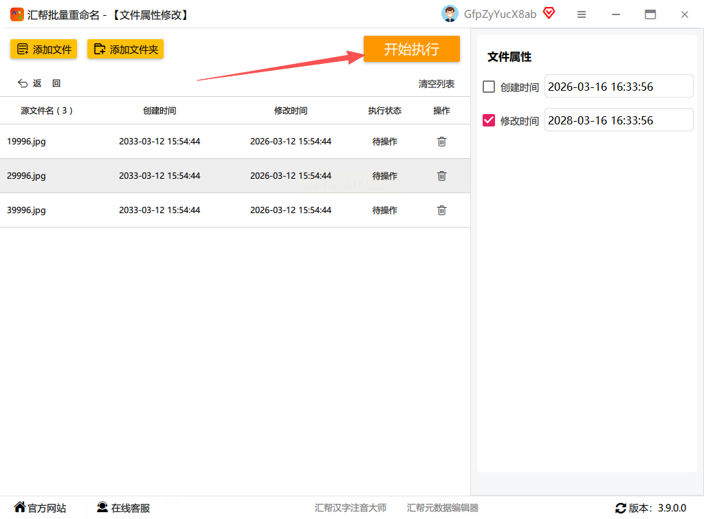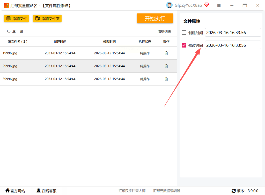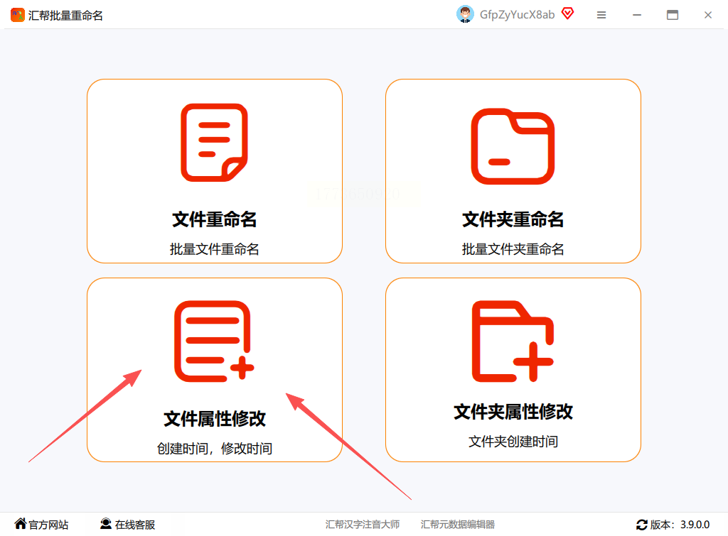 打开汇帮批量重命名软件,在界面中选择“文件属性修改”功能。