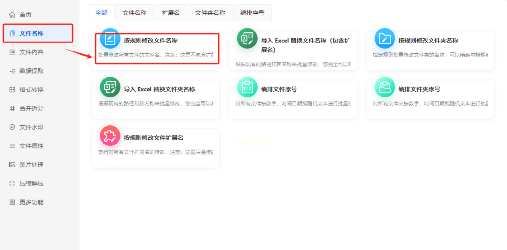 1. 打开工具选功能:打开软件工具箱,点「文件名称」→「按规则修改文件名称」。