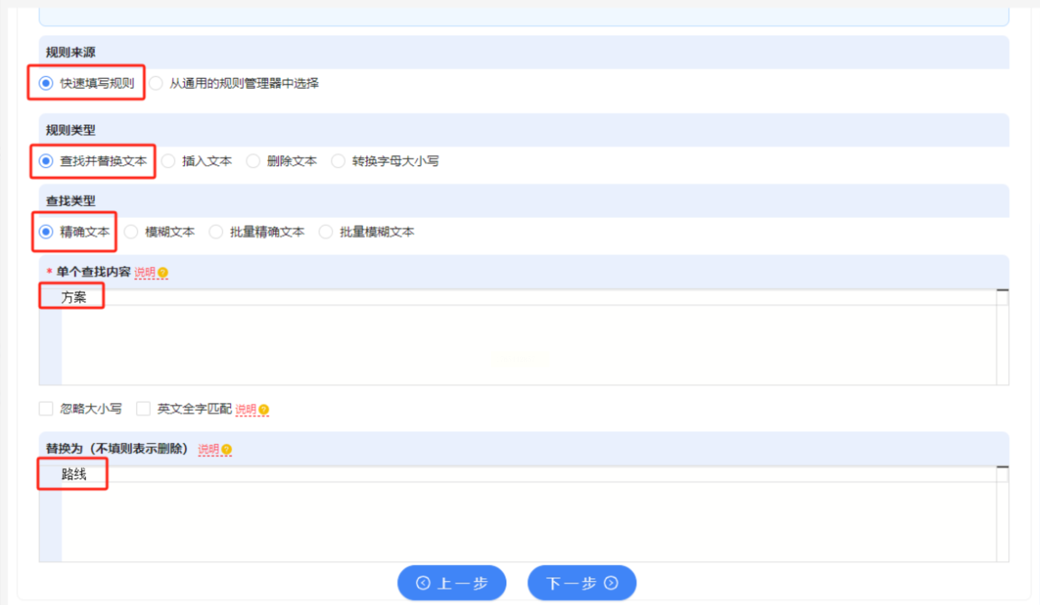 选「查找并替换文本」→「精确文本」,比如要把"旧格式"改成"新格式",就在「查找内容」填"旧格式",「替换为」填"新格式"。