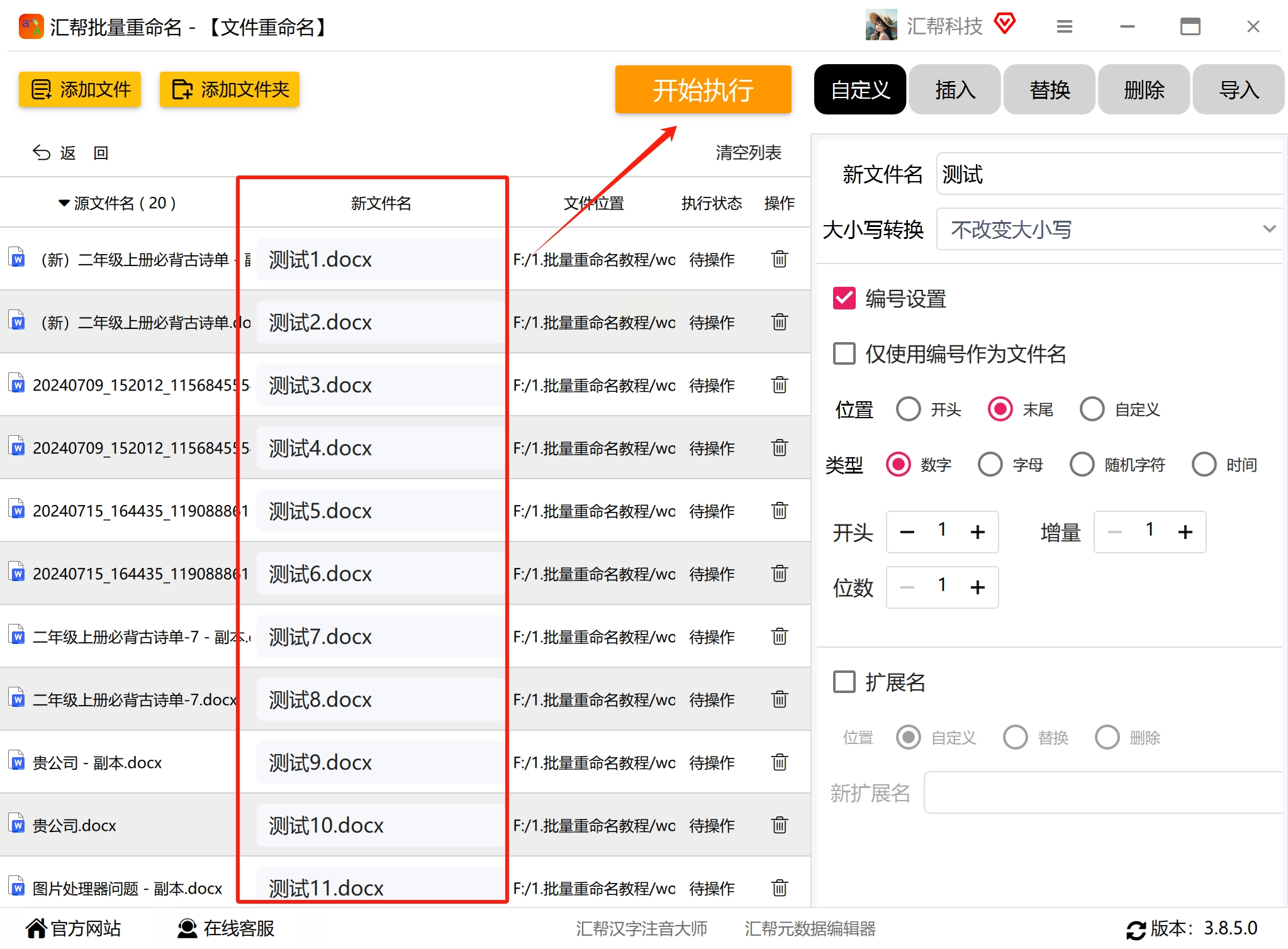 4. 预览完再执行:改完规则后,左侧会实时显示新文件名预览,你可以滚动鼠标滚轮放大看细节,确认无误后点「开始执行」。
