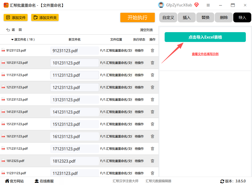 上传完文件后,右侧会出现“导入”选项。点击“导入”,选择你提前准备好的Excel表格。这里要注意,Excel表格里的内容需要提前设置好新旧文件名的对应关系,第一列写原来的文件名,第二列写你想要改成的新文件名。比如原来的文件是“资料1.docx”,你就可以在表格里第一行写“资料1.docx”,第二行写“季度报告.docx”,以此类推,把所有需要修改的文件名都按格式填好。
