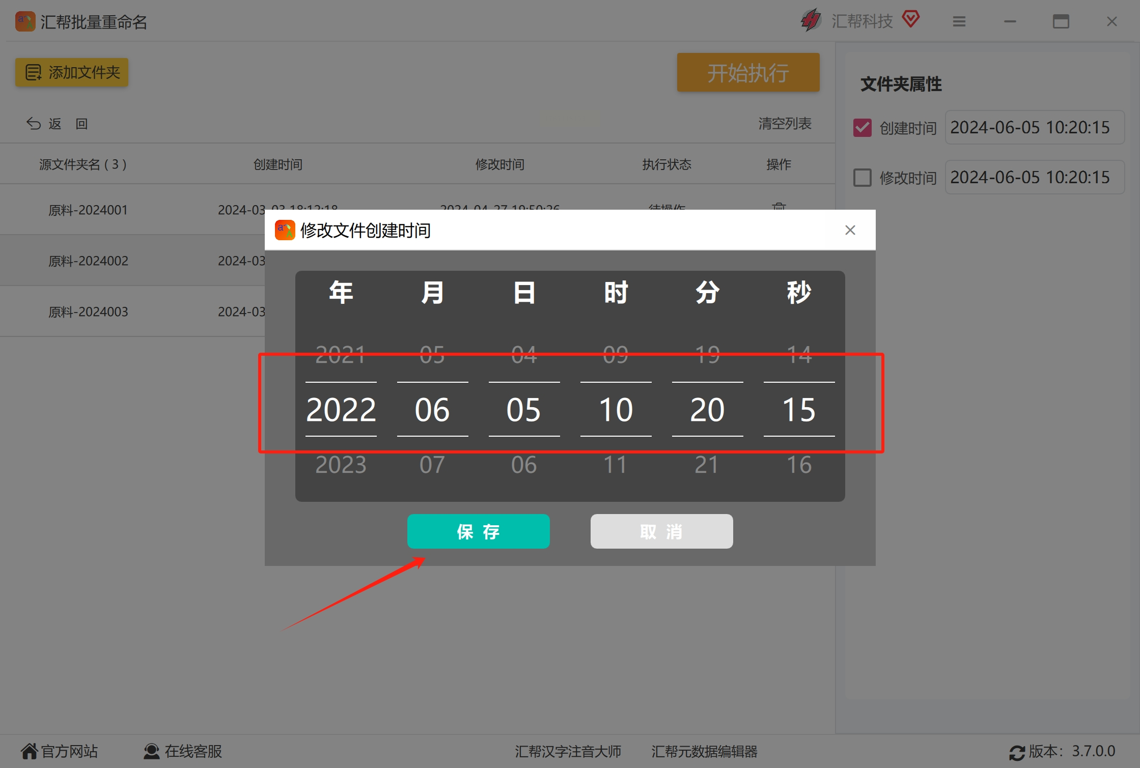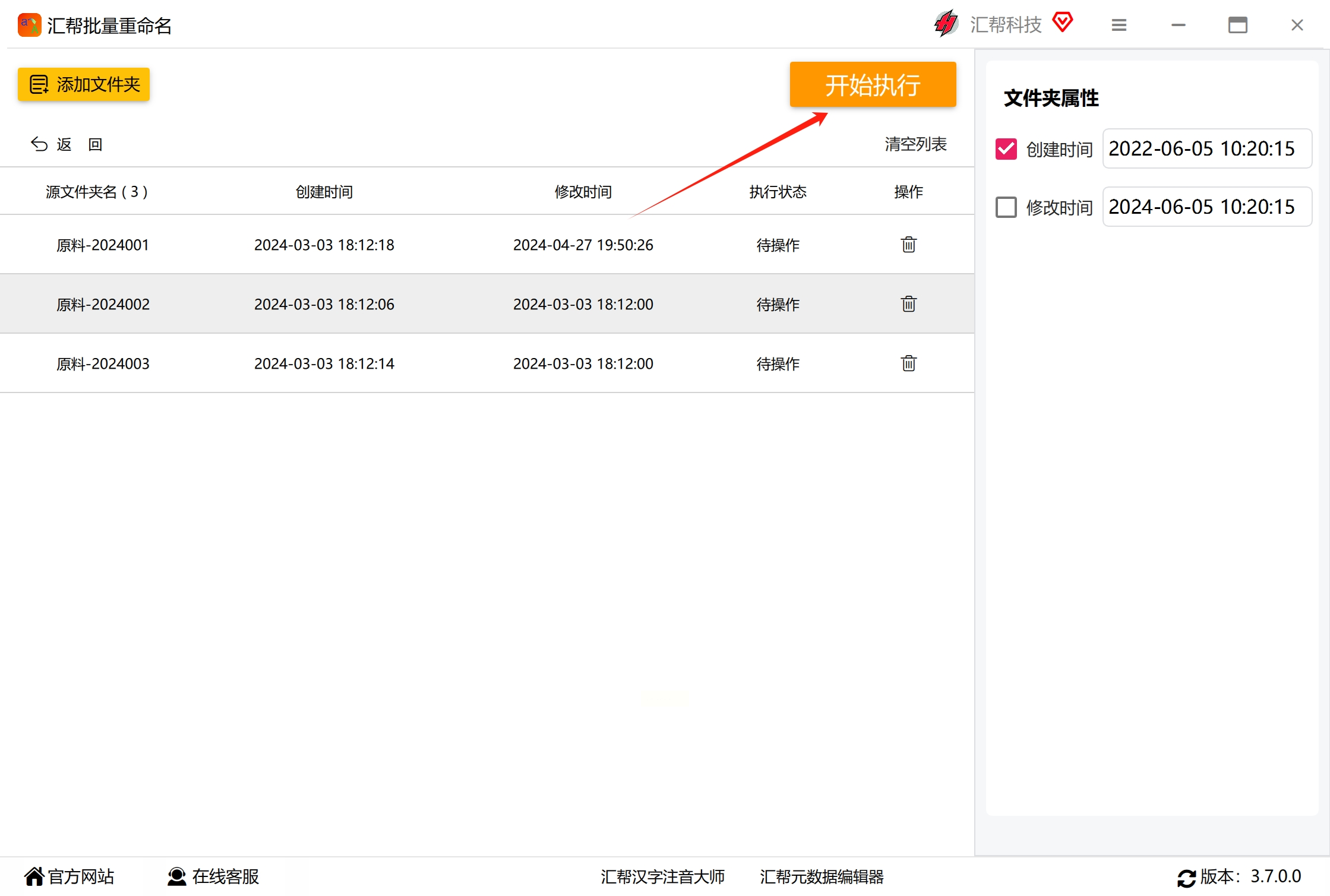 5. 执行修改:点击界面下方的“开始执行”,软件会自动修改所有选中文件夹的创建时间。