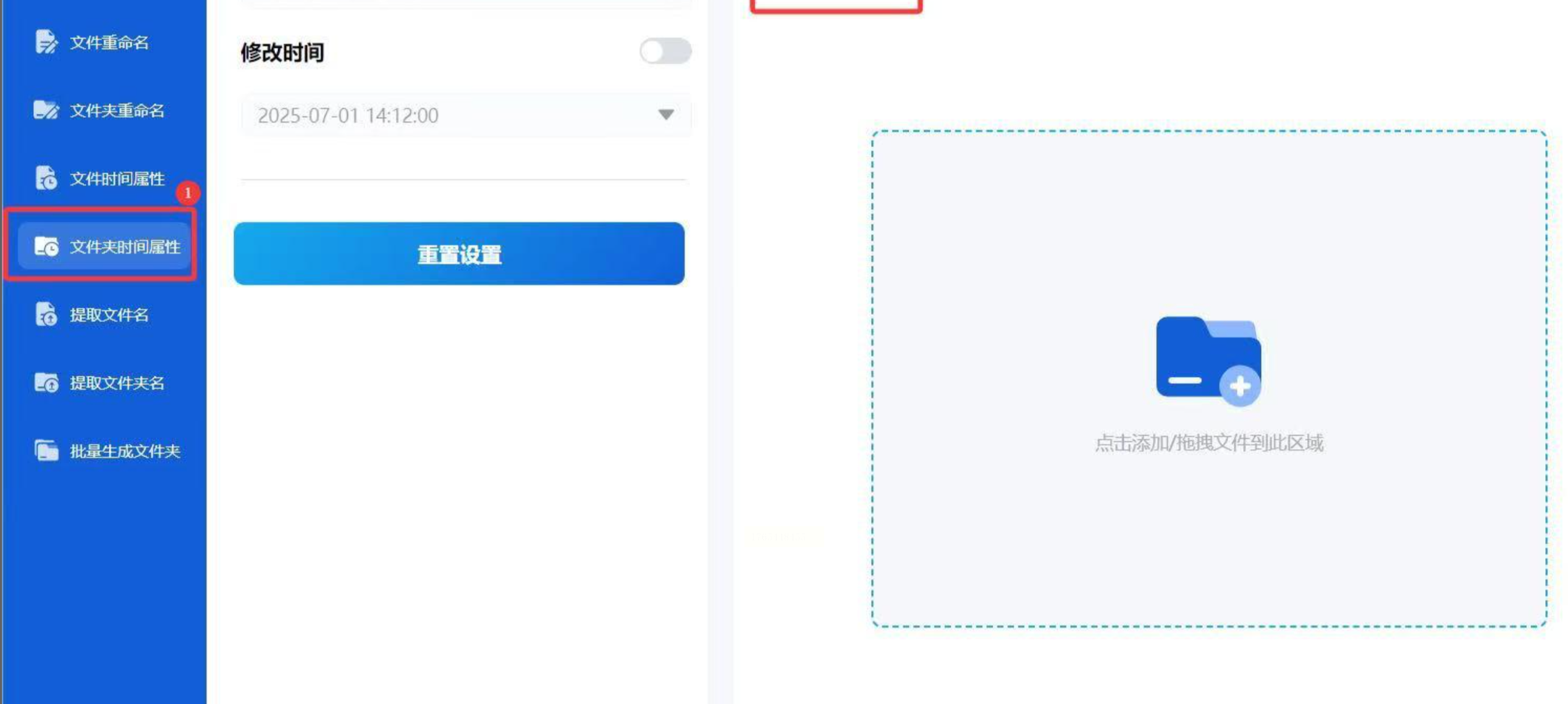 1. 打开软件:安装后打开「惠普批量重命名」,在左侧菜单找到「文件夹时间属性」功能并点击。