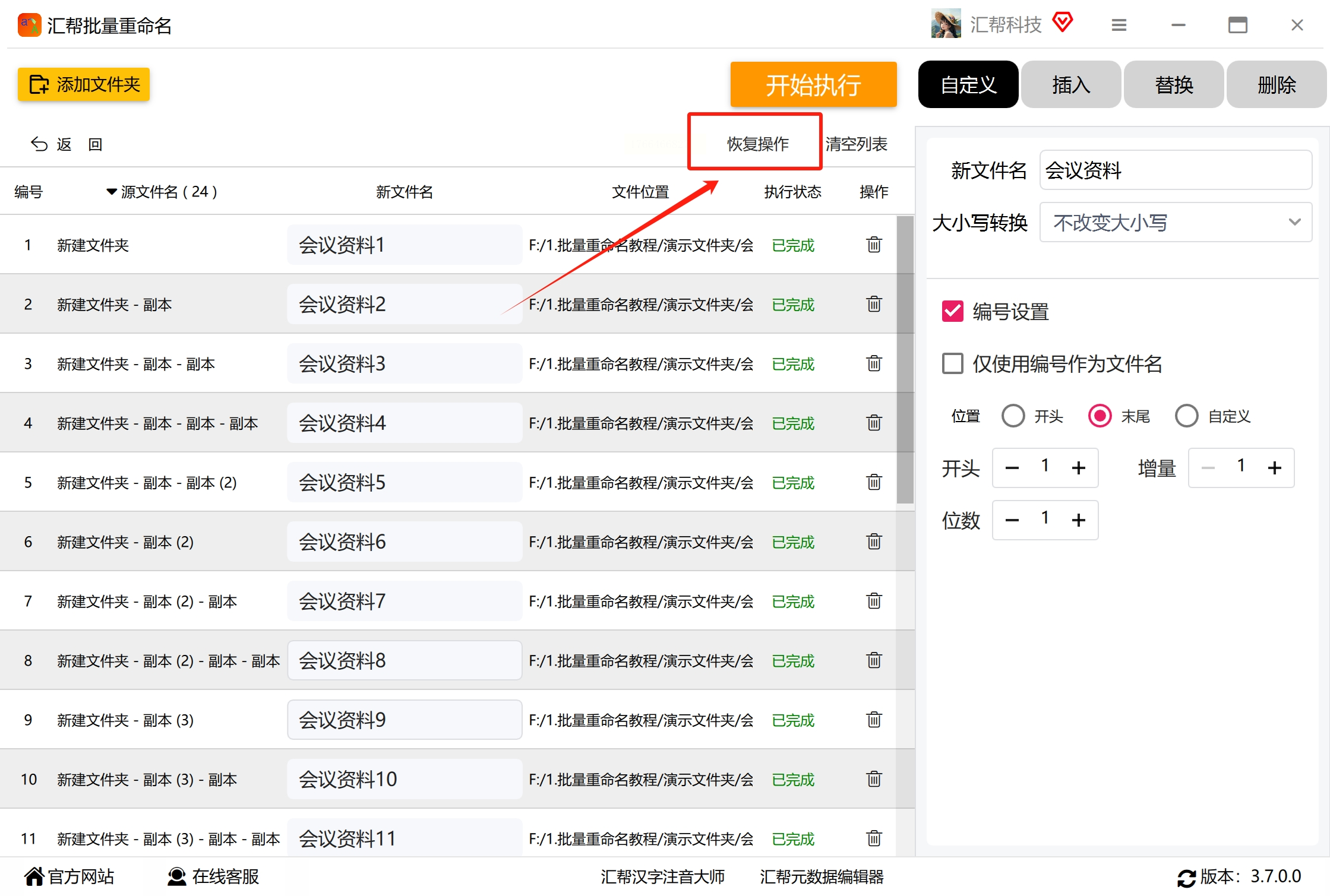 5. 恢复功能:若操作错误,点击“恢复操作”可回滚到修改前状态(仅支持上一次操作)。