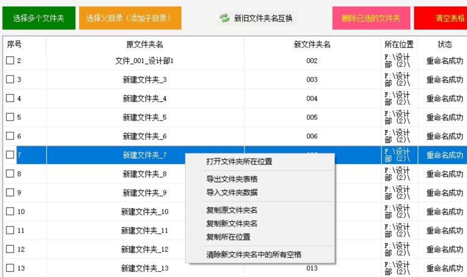 4. 执行重命名:点击“开始改名”,等待进度条完成(约1秒/个文件夹)。
