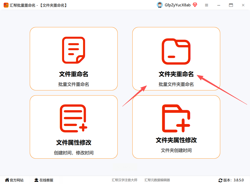 步骤一:下载并打开汇帮批量重命名软件,选择“文件夹重命名”功能。这个选项位于主界面,点击即可进入操作页面。