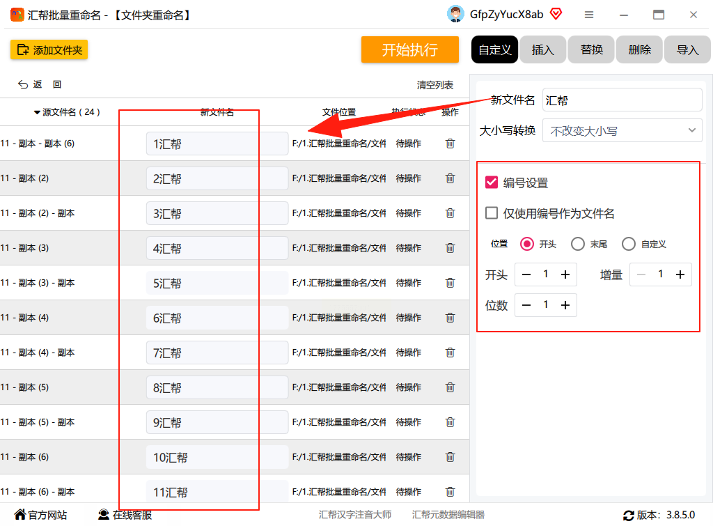 还有编号功能,选上"仅使用编号作为文件名",系统会自动生成1、2、3...,如果想从10开始,直接改起始数字就行。改完点开始执行,进度条走完就搞定,比手动一个个改快10倍不止,批量改文件夹名称用它超省心。