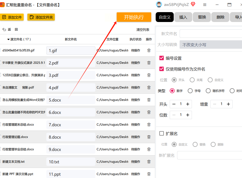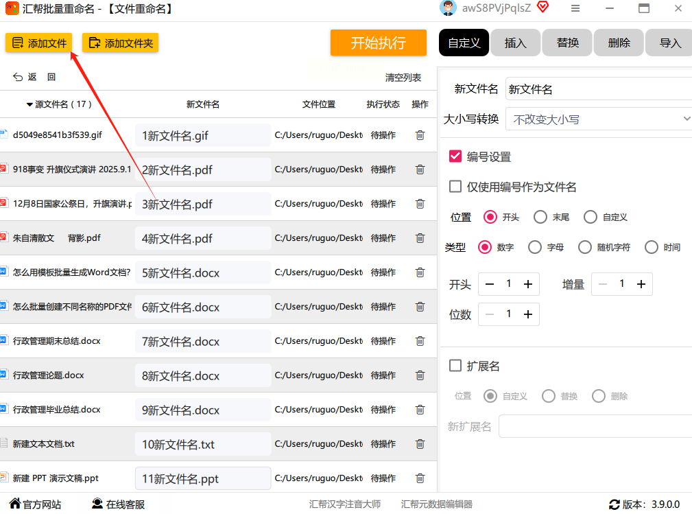上传完成后,工具会显示文件列表。找到"顺序"或"编号"选项卡,选择"数字顺序",设置起始编号(如1)和增量(默认1)。有些工具还支持自定义前缀,比如"项目资料_1"。