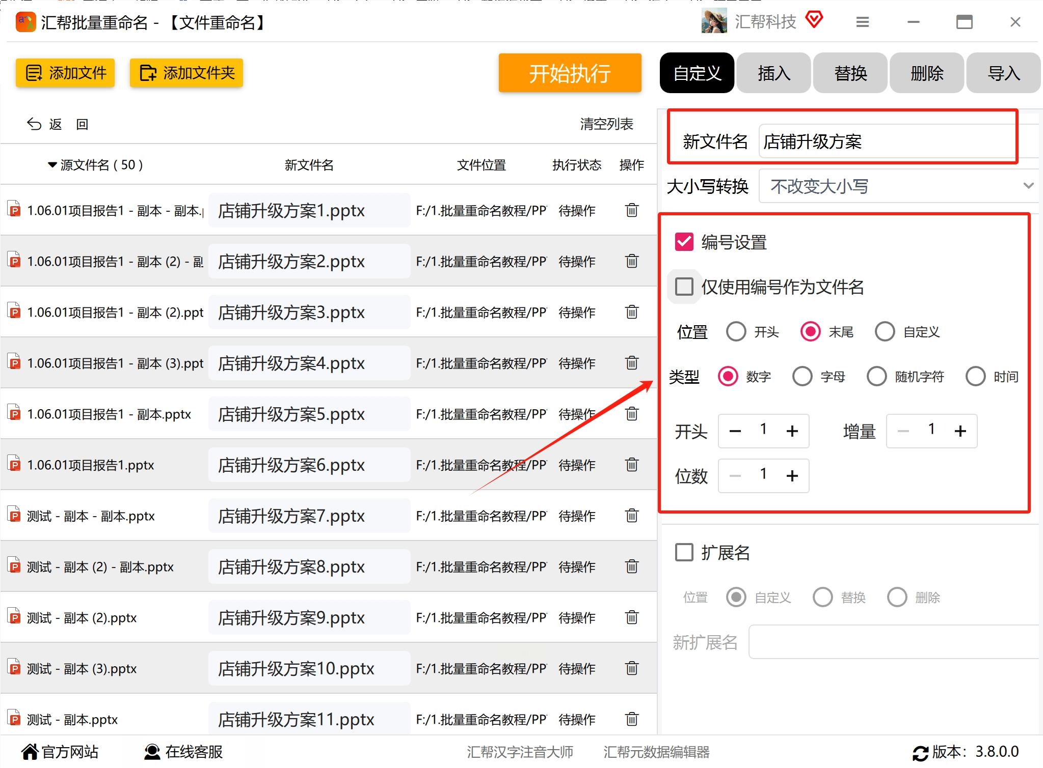 4. 在自定义设置中,输入新文件名的固定部分(如“项目总结_”),并设置编号规则,包括起始值、增量、位数(如三位数显示为001)及编号位置(前缀或后缀)。