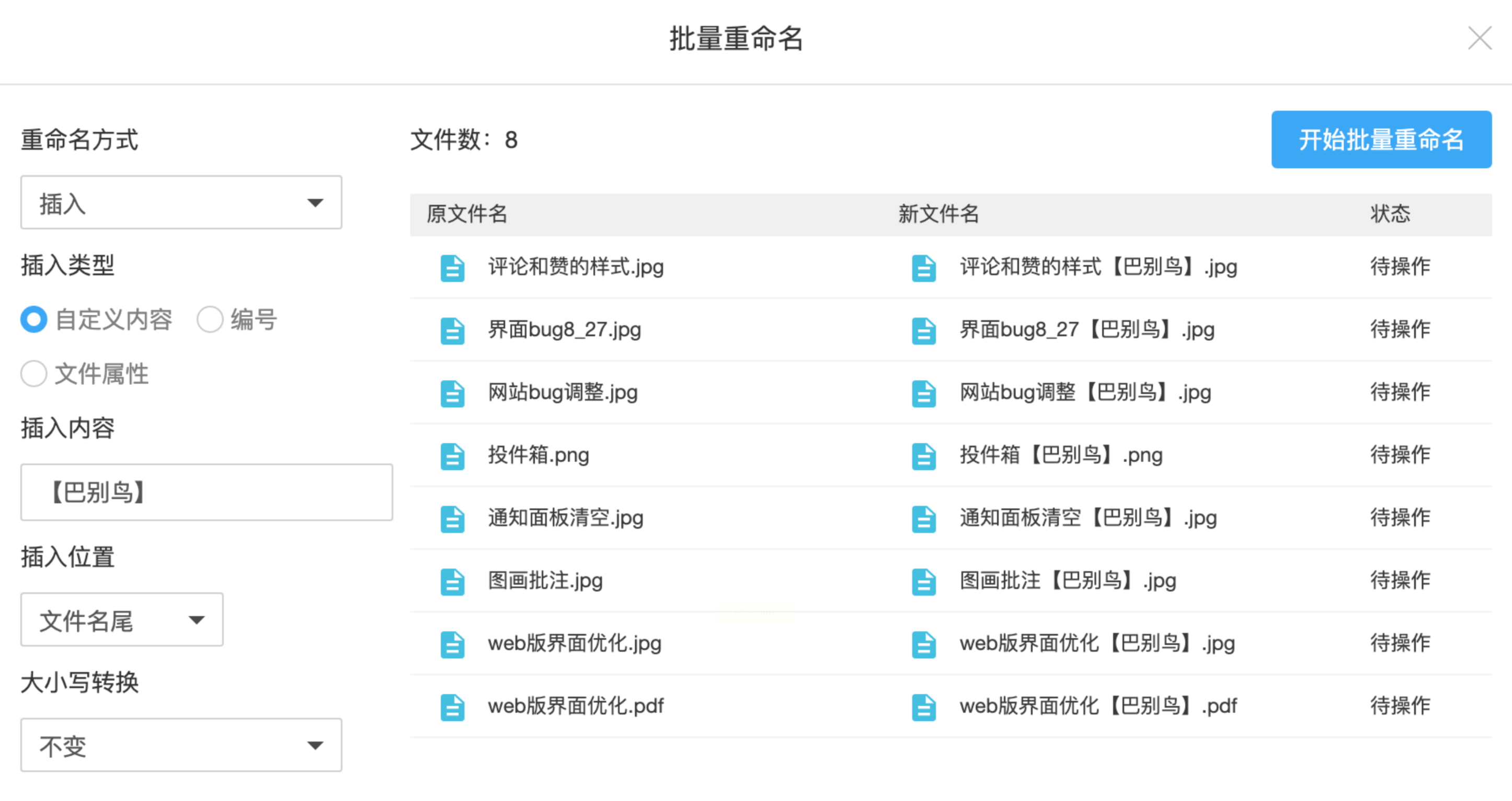 4. 系统会实时显示新文件名预览,确认无误后点击“开始批量重命名”。稍等片刻,所有选中文件将同步更新名称。