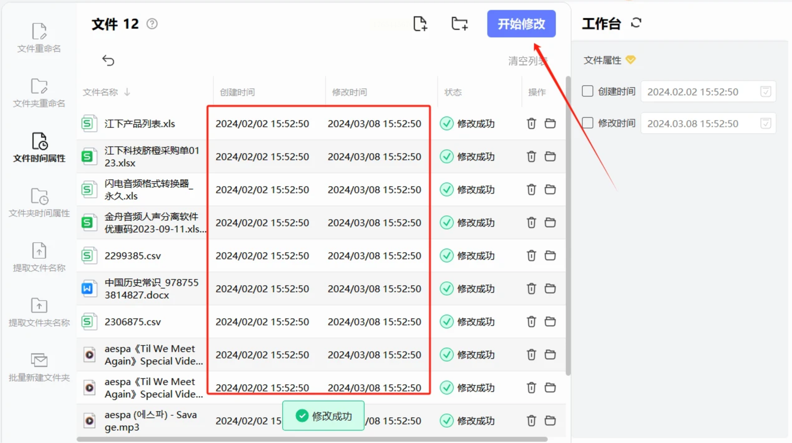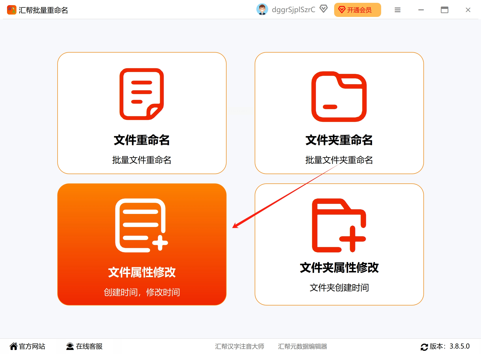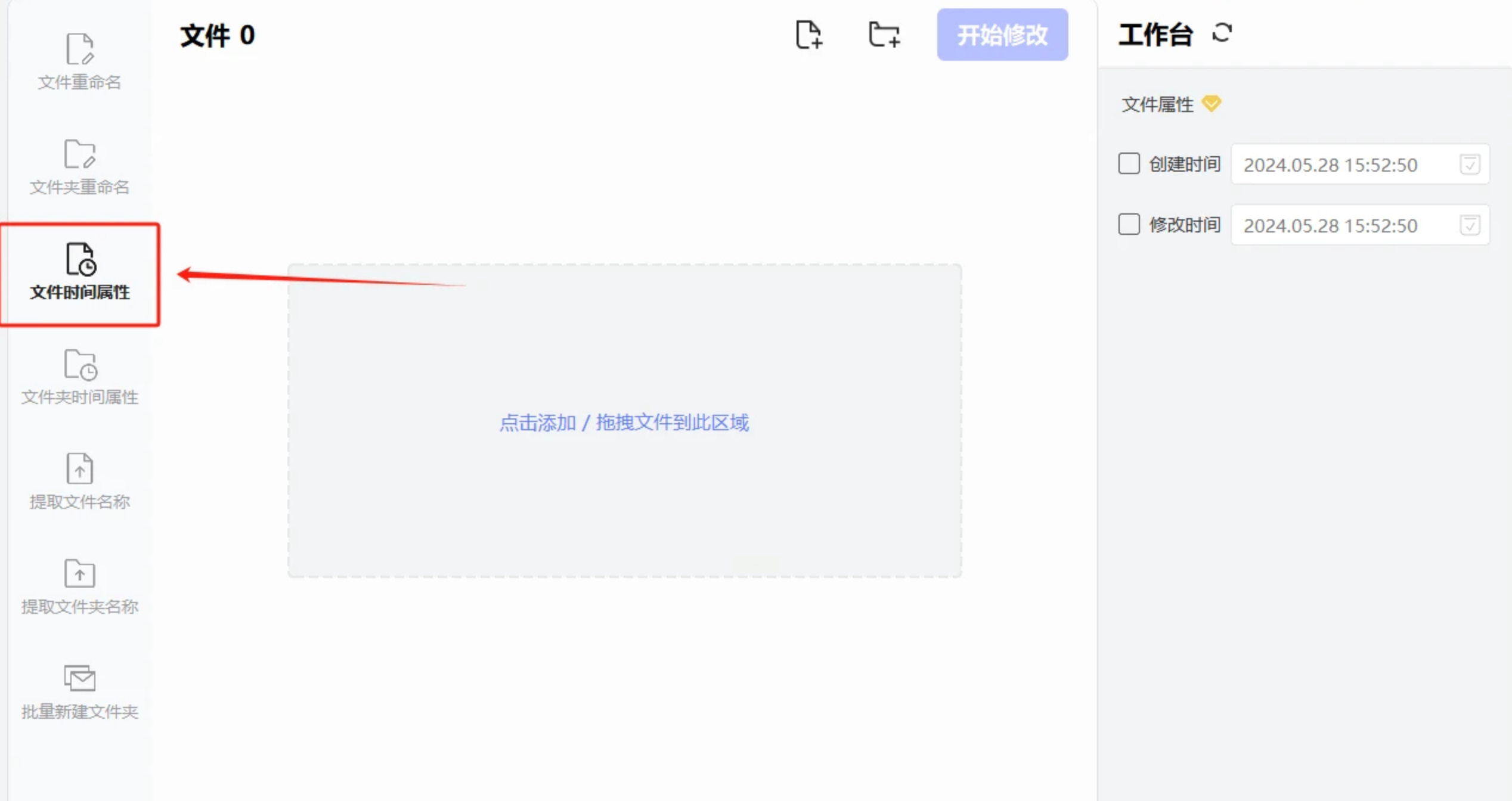 下载并安装它。安装完成后,在桌面或开始菜单找到它并双击打开。进入主界面后,你会看到多个功能选项,我们直接找到并点击 【文件属性修改】 这个按钮,进入核心操作区。