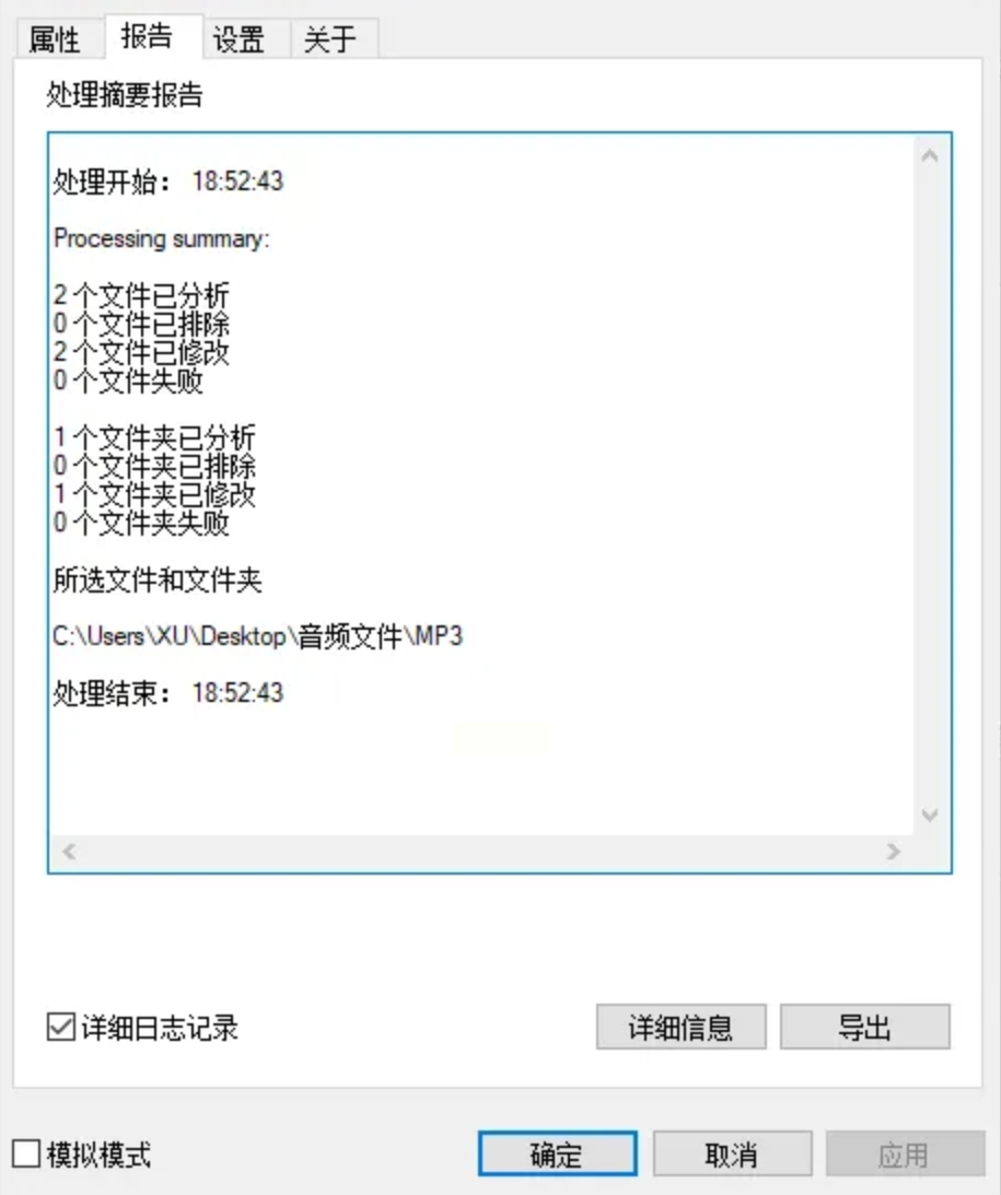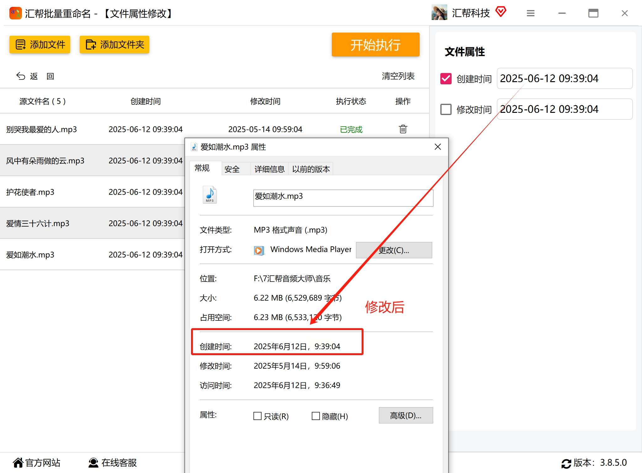 软件运行完毕后会给出成功提示。最直接的验证方法永远是“眼见为实”:立刻去文件夹里,右键点击歌曲文件查看 【属性】,在 【常规】 选项卡的底部,你就能清晰地看到“创建日期”和“修改日期”是否已经更新。