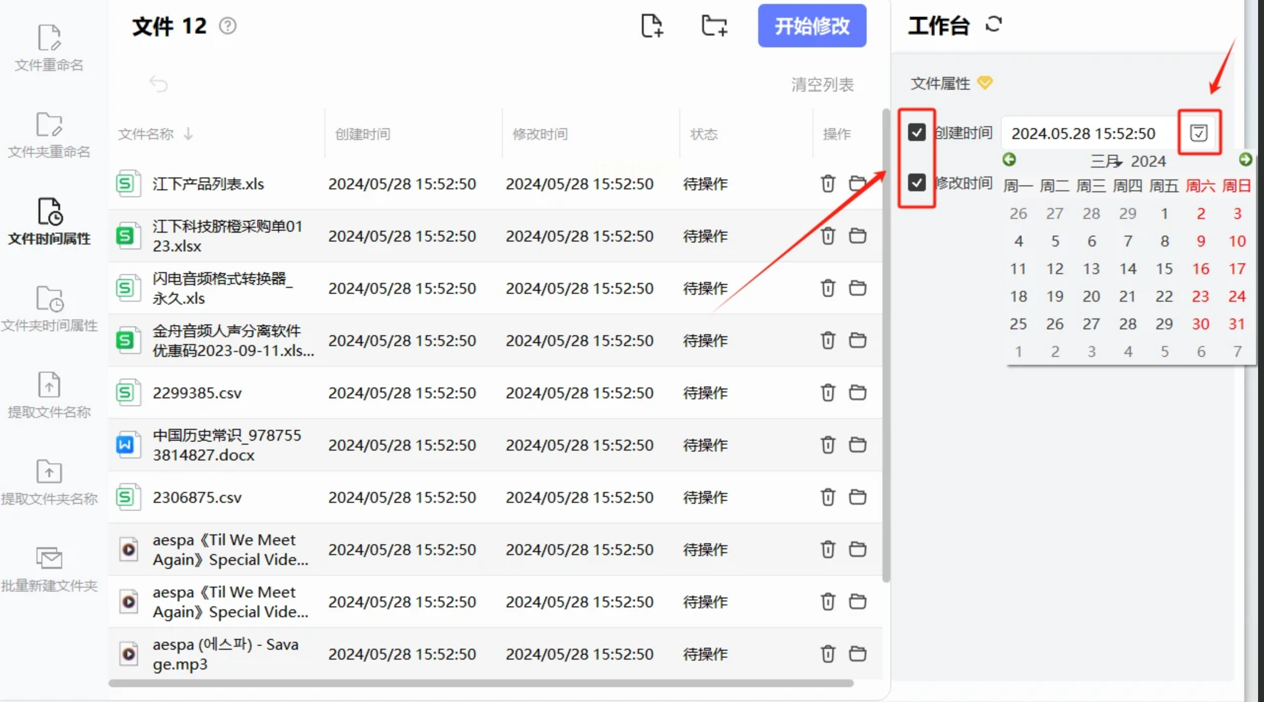 点击 【添加文件】 或 【添加文件夹】 按钮,把你的歌曲们导入到软件列表里。同样支持多种音频格式。在右侧的设置区域,你会看到 【创建时间】 和 【修改时间】 的选项。你可以根据需求单独勾选一个,或者两个一起勾选进行批量修改。勾选后,点击旁边的 【日历】 图标或时间输入框。