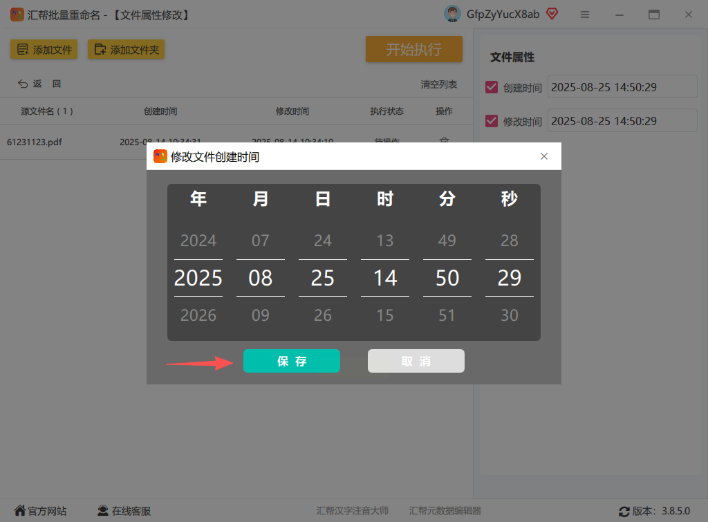 文件导入后,右侧会显示每个PDF的原始创建时间和修改时间。点击时间区域的"修改"按钮,弹出时间选择框,你可以手动调整到任意时间点,确认无误后点击"保存"。