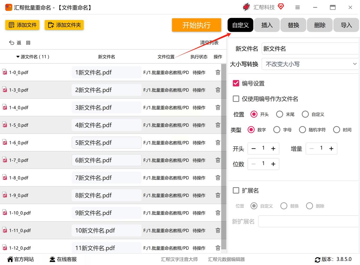 点击右侧“自定义”选项卡,在输入框中填写新文件名的基础部分,