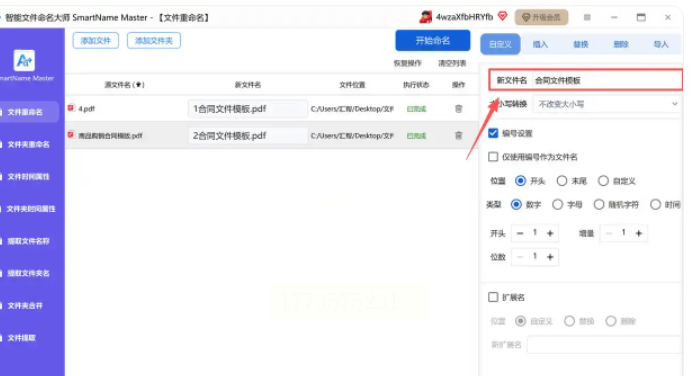 此时左侧预览区会实时显示每个文件的新名称,比如设置“项目A报告”+3位编号后,文件会显示为“项目A报告_001.pdf”“项目A报告_002.pdf”等。