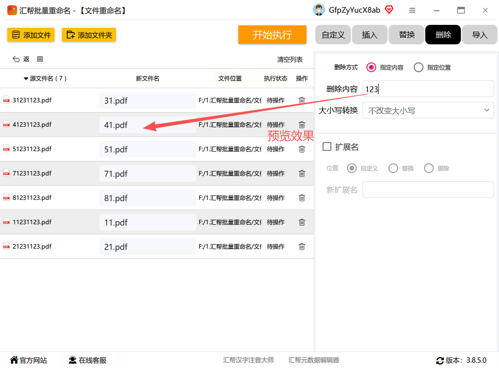 文件导入后,右侧操作栏选择“删除”功能,这里以删除文件名后缀为例,选择“指定内容删除”方式。