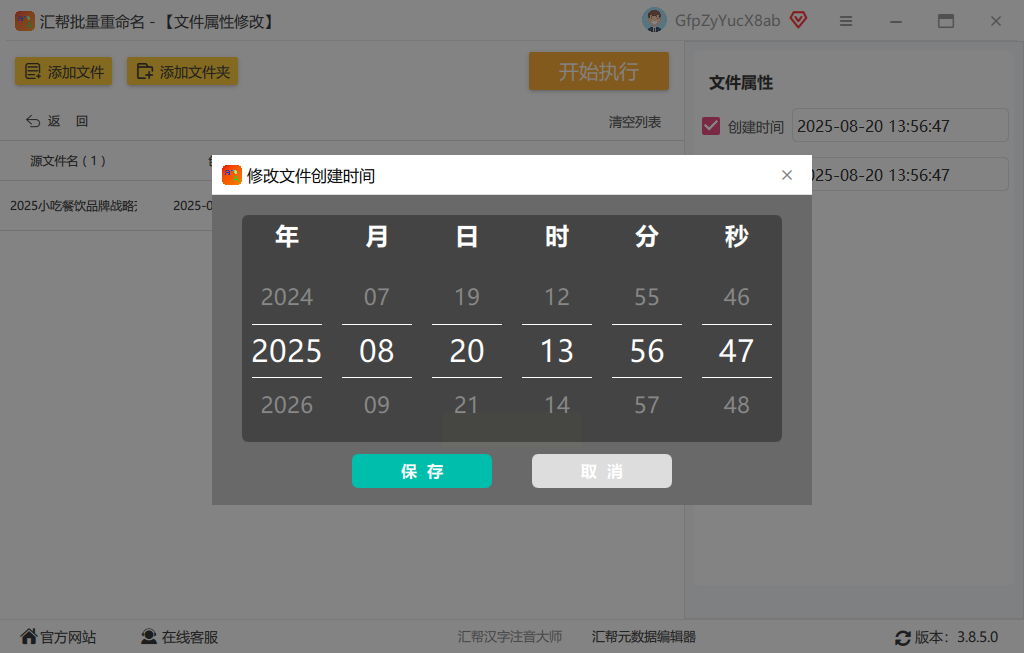 文件导入后,右侧会显示文件的原始创建时间和修改时间。点击“创建时间”或“修改时间”字段,弹出时间选择窗口。