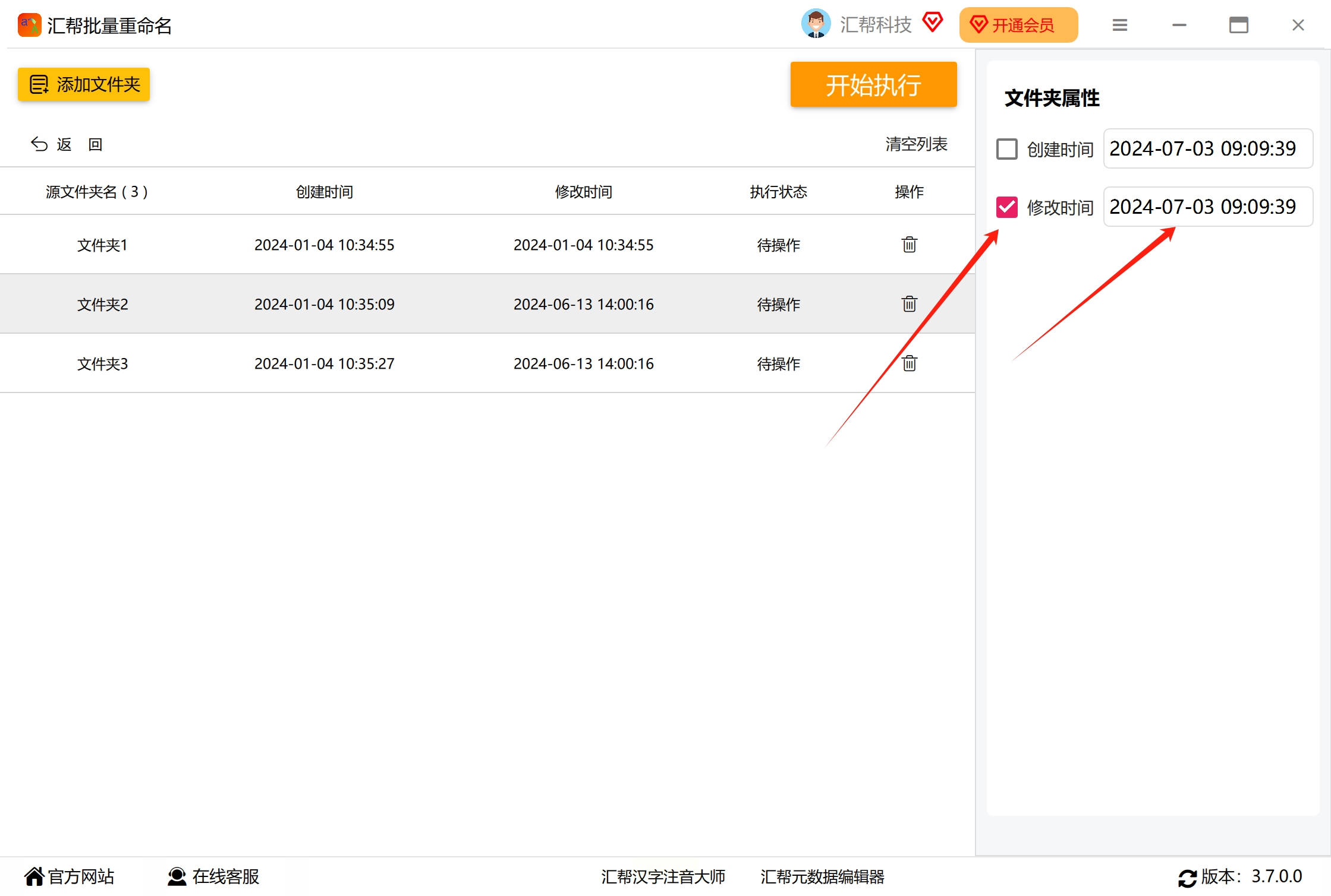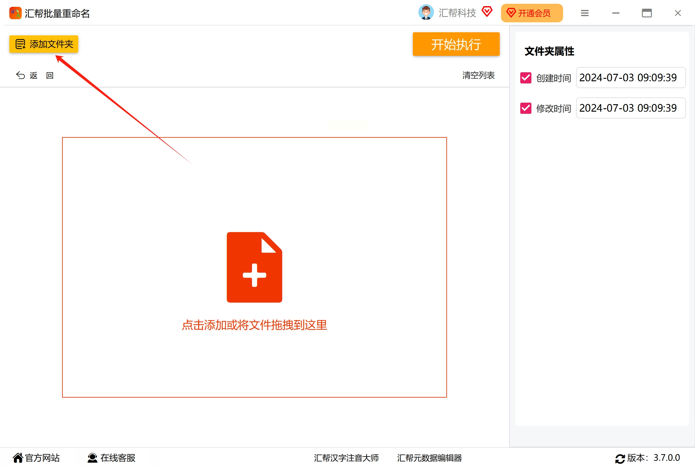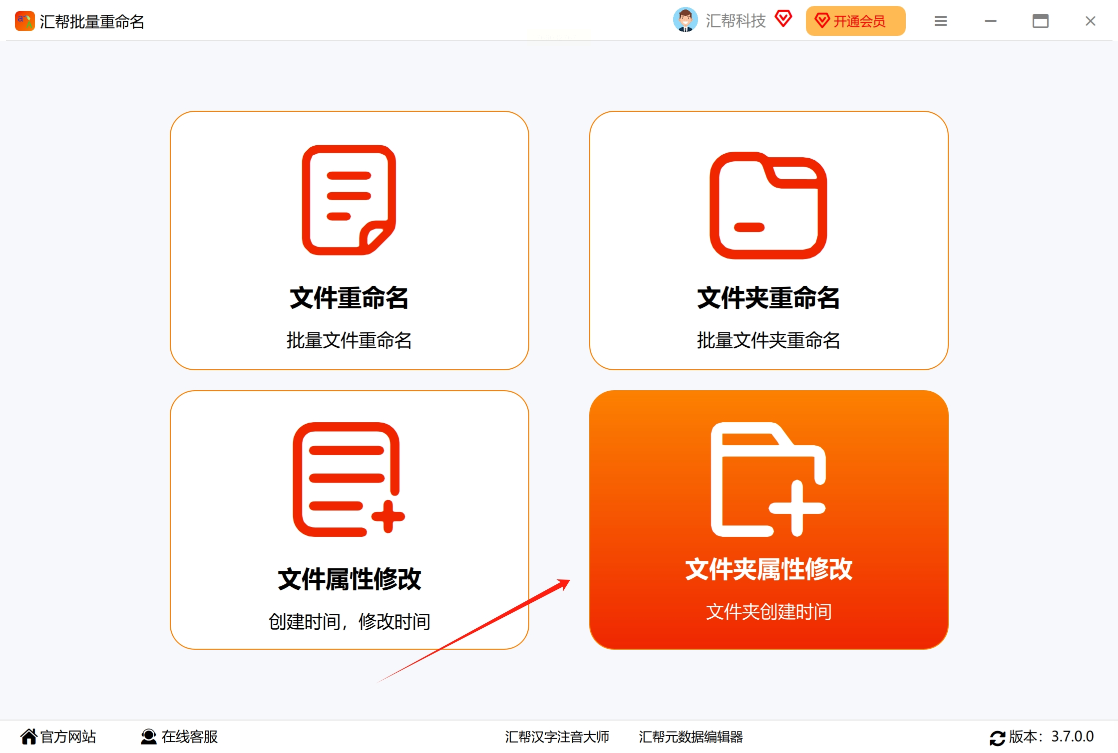 首先,在电脑上打开“汇帮批量重命名”软件。进入主界面后,你会看到多个功能选项,例如“文件重命名”、“文件夹重命名”和“文件属性修改”等。这里我们需要修改的是文件夹的时间属性,所以请点击“文件夹属性修改”选项,进入相应的功能页面。