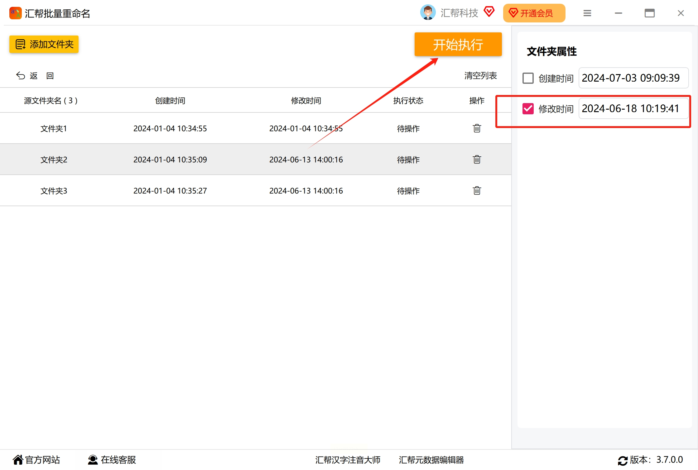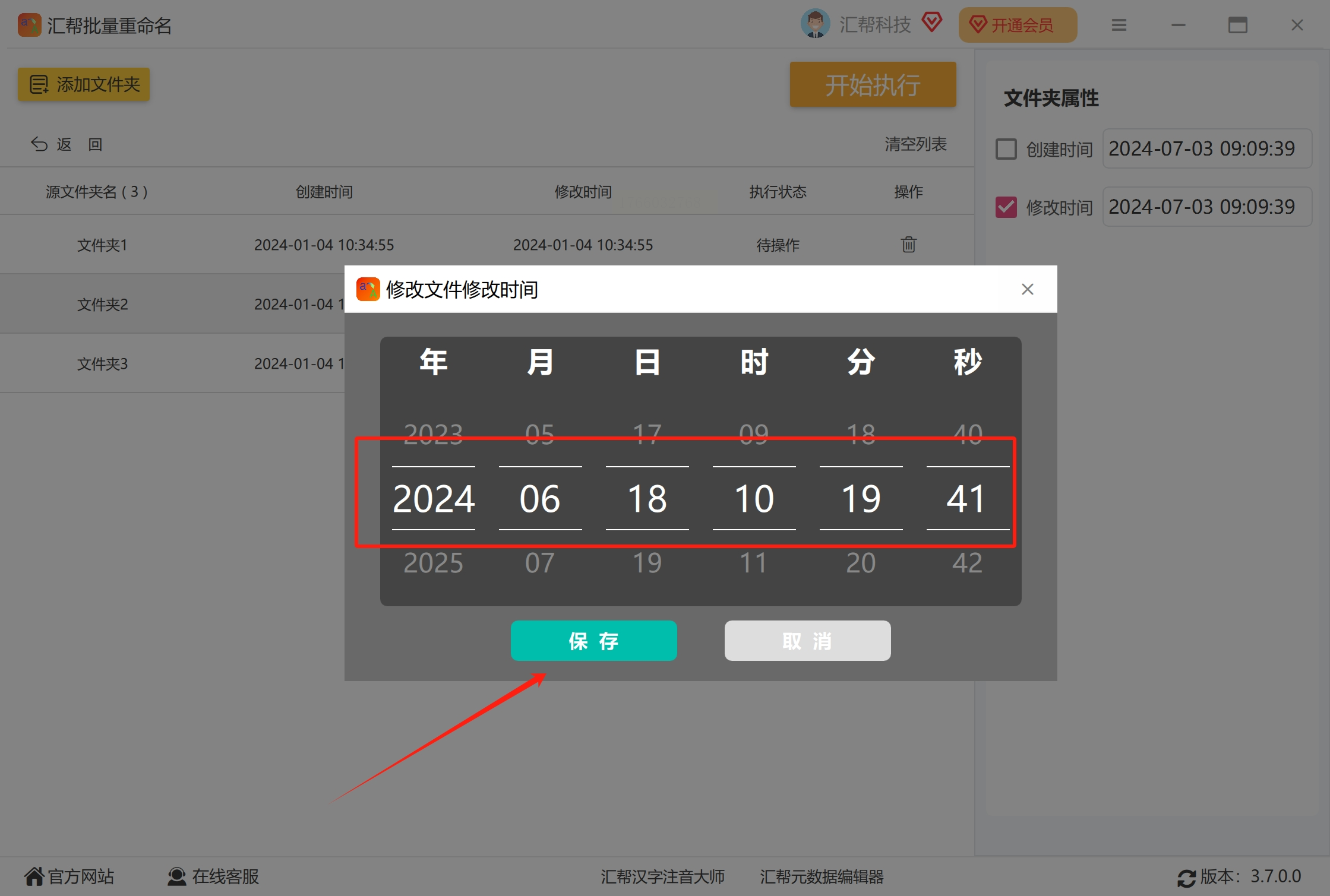 确认时间设置无误后,点击软件界面中的“开始执行”按钮。软件会自动处理所选文件夹,并修改它们的修改时间。这个过程通常很快,完成后会提示操作成功。