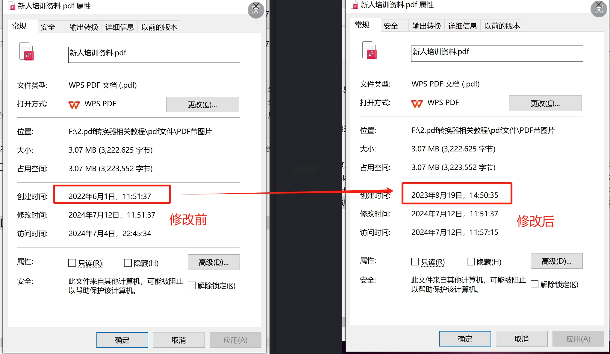 6. 验证效果:右键查看PDF属性,确认时间已更新为你设置的值。
