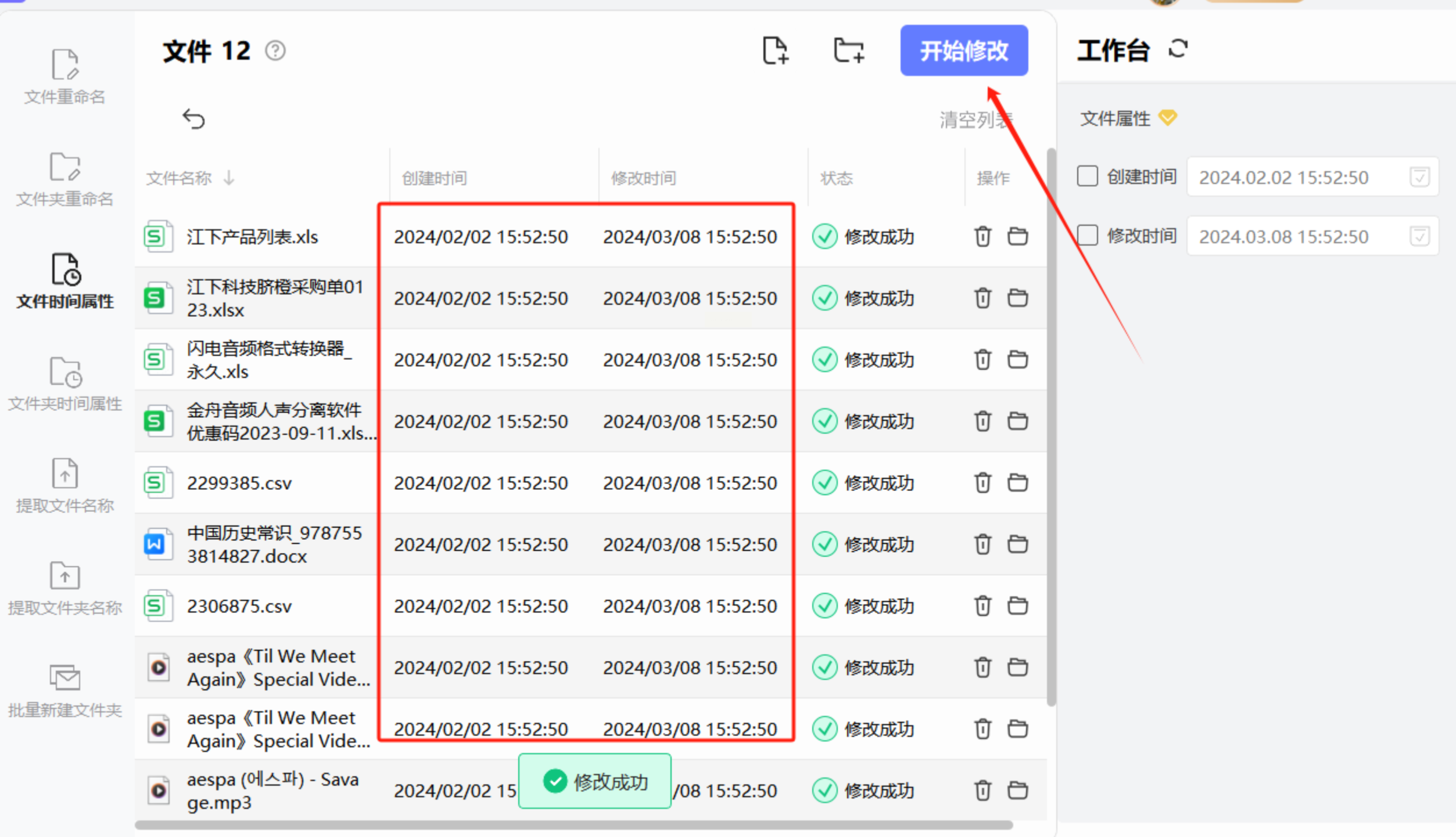 4. 开始批量修改:点击“开始修改”,软件会逐个更新文件属性,完成后会提示“批量修改成功”。