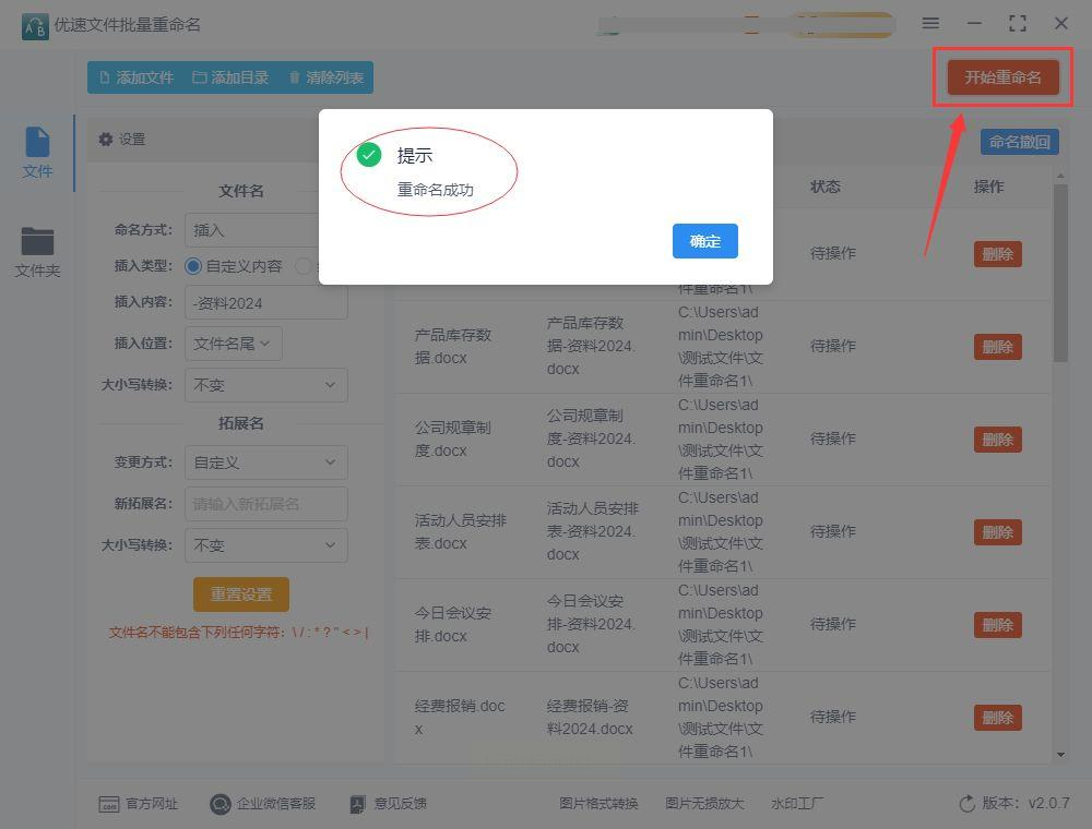 6. 开始处理:点击红色的“开始重命名”按钮,软件开始批量处理。处理过程中会显示进度条,完成时会弹出“重命名成功”的提示框。
