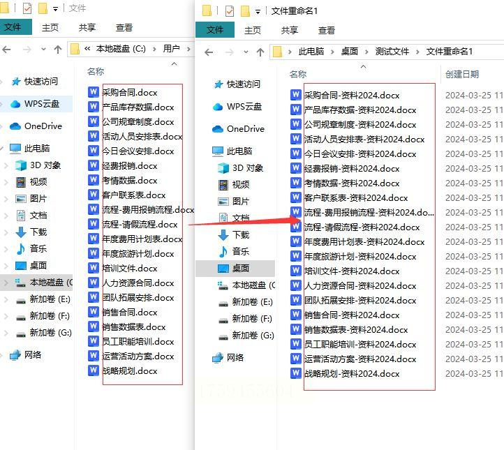 7. 验证结果:打开文件所在文件夹,可以看到所有文件名后面都已经成功添加了设定的字符,比如“-资料2024”。