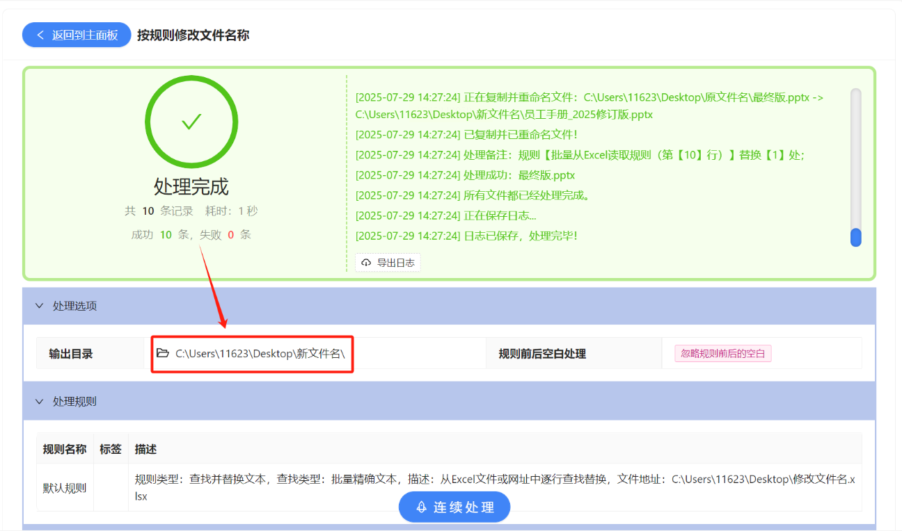 点击处理,稍等片刻。完成后,软件会告诉你输出目录在哪。点进去一看,你会发现文件们已经严格按照你的Excel清单,完成了“一对一”精准换名!这种方法虽然多了一步做表格,但对付复杂改名需求,绝对是核武器级别的精准。