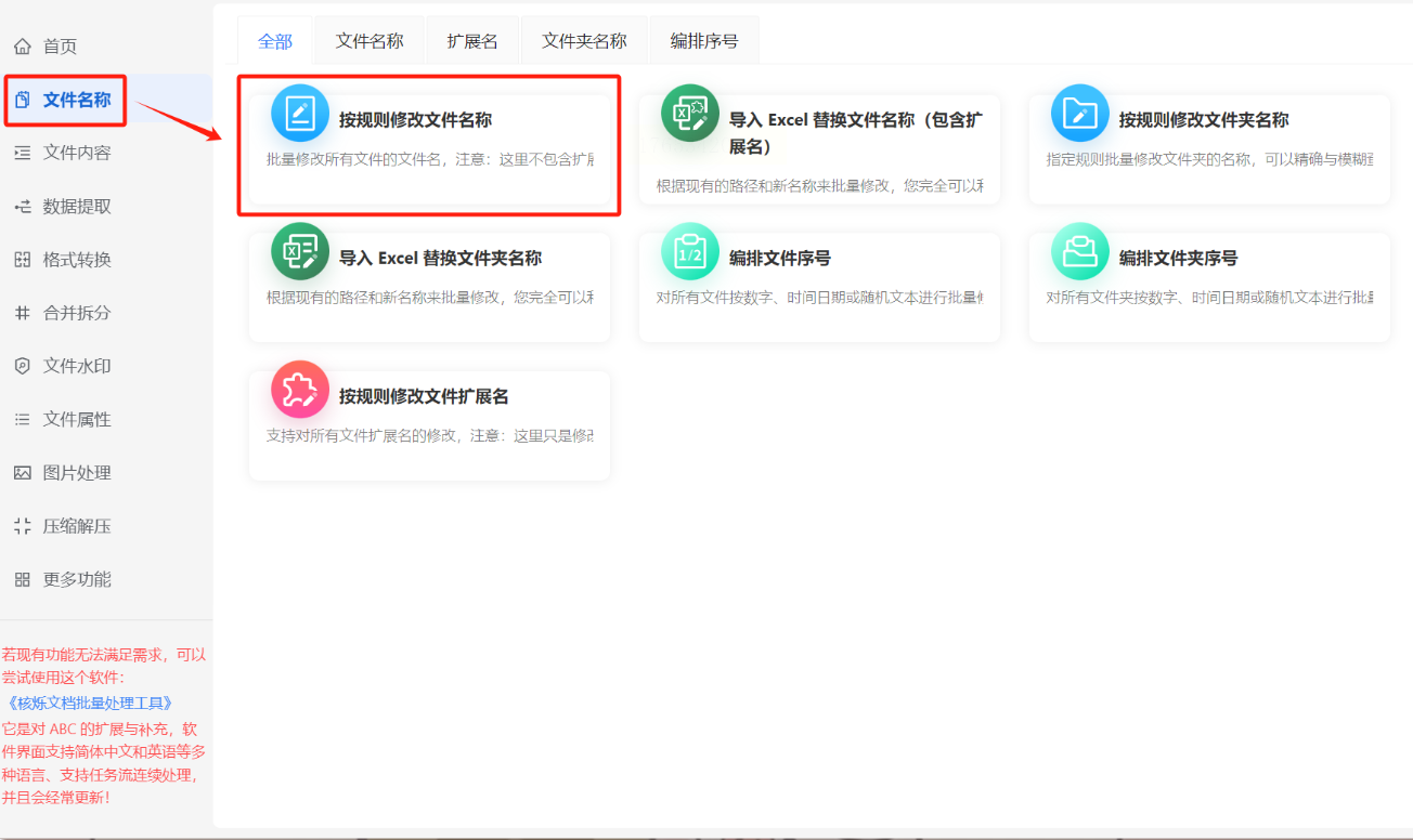 这里我们需要一个能读懂这份清单的软件,比如“我的ABC软件工具箱”。打开它,在菜单里找到 【文件名称】 下面的 【按规则修改文件名称】 功能。